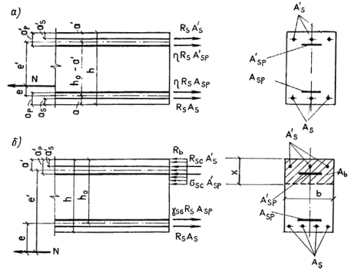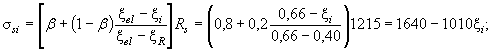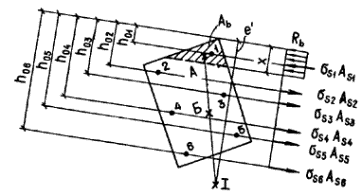где h0i - расстояние от оси, проходящей через центр тяжести сечения рассматриваемого i-го стержня арматуры и параллельной прямой, ограничивающей сжатую зону, до наиболее удаленной точки сжатой зоны сечения (см. черт. 10); xRi, xel,I - относительная высота сжатой зоны, отвечающая достижению в рассматриваемом стержне напряжений, соответственно равных Rsi и bRsi, значение xRi определяют по формуле (21) п. 3.6, значение xel,i - также по формуле (21), принимая ssR = bRsi - sspi, (65) здесь b - коэффициент, принимаемый равным: при механическом, а также автоматизированных электротермическом и электротермомеханическом способах натяжения арматуры классов А-IV, А-V, А-VI