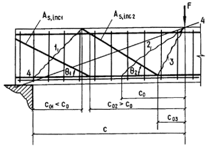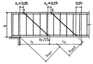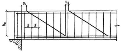 Момент усилия в арматуре относительно центра тяжести нижнего ряда проволок определим по формуле SssiSsi = SssiAsi(h01 - hoi). Вычисление SssiSsi приведено в табл. 28а. Проверяем условие (60): RbSb - SssiSsi = 24×1,65×106 - 11,9×106 = 27,7×106 Н×мм = 27,7 кН×м > M = 26 кН×м, т.е. прочность шпалы обеспечена. РАСЧЕТ СЕЧЕНИЙ, НАКЛОННЫХ К ПРОДОЛЬНОЙ ОСИ ЭЛЕМЕНТА3.19 (3.29). Расчет элементов по наклонным сечениям должен производиться для обеспечения прочности: на действие поперечной силы по наклонной полосе между наклонными трещинами - согласно п. 3.21; на действие поперечной силы по наклонной трещине для элементов с поперечной арматурой - согласно пп. 3.22 - 3.29, для элементов без поперечной арматуры - согласно п. 3.30; на действие изгибающего момента по наклонной трещине - согласно пп. 3.31 - 3.34. Расчет элементов с поперечной арматурой на действие поперечной силы, согласно пп. 3.22 - 3.29, не производится, если выполняются условия прочности п. 3.30. При соблюдении этих условий поперечная арматура определяется конструктивными требованиями (см. пп. 5.41 и 5.42). Примечание. В настоящем Пособии под поперечной арматурой имеются в виду хомуты и отогнутые стержни (отгибы). Термин «хомуты» включает в себя поперечные стержни сварных каркасов и хомуты вязаных каркасов. 3.20. Расстояния между хомутами s, между опорой и концом отгиба, ближайшего к опоре, s1, а также между концом предыдущего и началом последующего отгиба s2 (черт. 12) должны быть не более величины где jn - см. п. 3.22; jb4 - см. табл. 29. Кроме того, эти расстояния должны удовлетворять конструктивным требованиям пп. 5.42 и 5.44. Черт. 12. Расстояния между хомутами и отгибами РАСЧЕТ НА ДЕЙСТВИЕ ПОПЕРЕЧНОЙ СИЛЫ ПО НАКЛОННОЙ СЖАТОЙ ПОЛОСЕQ £ 0,3jw1jb1Rbbh0, (68) где Q - поперечная сила, принимаемая на расстоянии от опоры не менее h0; jw1 - коэффициент, учитывающий влияние хомутов, нормальных к продольной оси элемента, и определяемый по формуле jw1 = 1 + 5amw, (69) но не более 1,3;