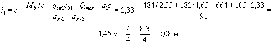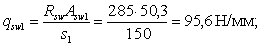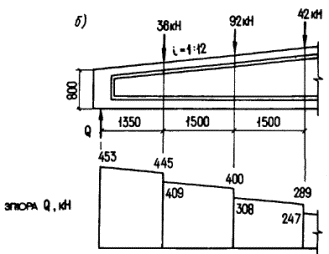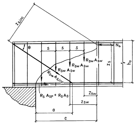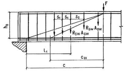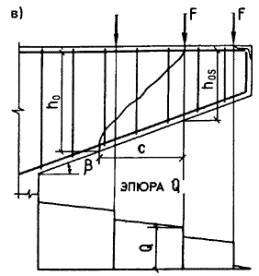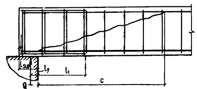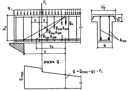 с принимается равным а) если равномерно распределенная нагрузка q всегда сплошная - q1 = q; б) если нагрузка q включает в себя временную эквивалентную равномерно распределенную нагрузку v (т.е. временная нагрузка несплошная, а эпюра моментов M от принятой в расчете нагрузки v всегда огибает эпюру M от любой фактической временной нагрузки) - q1 = g + v/2 (g - постоянная сплошная нагрузка). При этом значение Q принимается равным Qmax - q1c (Qmax - поперечная сила в опорном сечении). 3.23. Определение требуемой интенсивности хомутов, выражаемой через qsw (см. п. 3.22), производится следующим образом: а) при действии на элемент сосредоточенных сил,