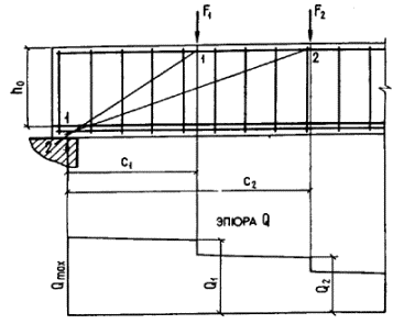 Значение Qb принимается не менее Qb,min = jb3(1 + jf + jn)Rbtbh0 (jb3 - см. табл. 29); qsw - усилие в хомутах на единицу длины элемента в пределах наклонного сечения, определяемое по формуле c0 - длина проекции наклонной трещины на продольную ось элемента, принимаемая равной: но не более с и не более 2h0, а также не менее h0, если c > h0. При этом для хомутов, устанавливаемых по расчету (т.е. когда не выполняются условия п. 3.30), должно удовлетворяться условие Разрешается не выполнять условие (78), если в формуле (73) учитывать такое уменьшенное значение Rbtb, при котором условие (78) превращается в равенство, т.е. если принимать Mb = 2h02qswφb2/φb3; в этом случае всегда c0 = 2h0, но не более c. При проверке условия (71) в общем случае задаются рядом наклонных сечений при различных значениях c, не превышающих расстояния от опоры до сечения с максимальным изгибающим моментом, а также значения (jb2/jb3)h0. При действии на элемент сосредоточенных сил значения с принимаются равными расстояниям от опоры до точек приложения этих сил (черт. 14). Черт. 14. Расположение невыгоднейших наклонных сечений при действии на элемент сосредоточенных и прерывистых нагрузок 1-1 и 2-2 - наклонные сечения, проверяемые на действие соответственно сил Q1 и Q2 При расчете элемента на действие равномерно распределенной