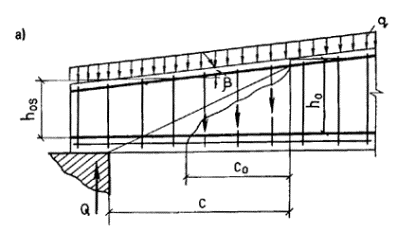 jb1 - коэффициент, определяемый по формуле jb1 = 1 - bRb, (70) b - коэффициент, принимаемый равным для бетона: тяжелого и мелкозернистого 0,01 легкого 0,02 Rb - в МПа. При линейном изменении ширины b по высоте в расчет [в формулы (67), (68) и последующие] вводится ширина сечения на уровне середины высоты сечения без учета полок. РАСЧЕТ НА ДЕЙСТВИЕ ПОПЕРЕЧНОЙ СИЛЫ ПО НАКЛОННОЙ ТРЕЩИНЕЭлементы постоянной высоты, армированные хомутами без отгибов3.22. Проверка прочности наклонного сечения на действие поперечной силы по наклонной трещине (черт. 13) производится из условия Q £ Qb + qswc0, (71) где Q - поперечная сила от внешней нагрузки, расположенной по одну сторону от рассматриваемого наклонного сечения; при вертикальной нагрузке, приложенной к верхней грани элемента, значение Q принимается в нормальном сечении, проходящем через наиболее удаленный от опоры конец наклонного сечения; при нагрузке, приложенной к нижней грани элемента или в пределах высоты его сечения, также допускается значение Q принимать в наиболее удаленном от опоры конце наклонного сечения, если хомуты, установленные на действие отрыва1, не учитываются в данном расчете; при этом следует учитывать возможность отсутствия временной нагрузки на участке в пределах наклонного сечения; 1 Расчет на отрыв производится согласно п. 3.97 «Пособия по проектированию бетонных и железобетонных конструкций из тяжелых и легких бетонов без предварительного напряжения арматуры» (М., ЦИТП Госстроя СССР, 1986). Черт. 13. Схема усилий в наклонном сечении элемента, армированного хомутами без отгибов, при расчете его на действие поперечной силы Qb - поперечное усилие, воспринимаемое бетоном и равное: Здесь Mb = jb2(1 + jf + jn)Rbtbh02; (73) jb2 - коэффициент, учитывающий вид бетона и определяемый по табл. 29; jf - коэффициент, учитывающий влияние сжатых полок и определяемый по формуле при этом величина (b¢f - b) принимается не более 3h¢f, учет полок производится, если поперечная арматура в ребре заанкерена в полке, где расположена поперечная арматура, соединяющая свесы полки с ребром; jn - коэффициент, учитывающий влияние предварительного напряжения арматуры растянутой зоны и определяемый по формуле где P = sspAsp - ssAs; суммарный коэффициент 1 + jf + jn принимается не более 1,5; c - длина проекции наклонного сечения на продольную ось элемента.