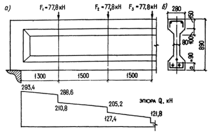 Пример 27. Дано: предварительно напряженная подкрановая балка с поперечным сечением по черт. 37, а; бетон тяжелый класса В30; геометрические характеристики приведенного поперечного сечения (определенные при коэффициенте приведения a = Es/Eb): площадь Ared = 339100 мм2; расстояние от центра тяжести сечения до нижней грани y0 = 728 мм, момент инерции Ired = 85850·106 мм4, продольная арматура S и S' - предварительно напряженная класса A-IV, площадью соответственно Asp = 4021 мм2 и A'sp = 942 мм2; поперечная арматура в виде сварных хомутов класса A-III, диаметром 12 мм, шагом 100 мм, по два в сечении; усилие предварительного обжатия с учетом всех потерь напряжений P = 1536 кН, его эксцентриситет относительно центра тяжести сечения e0p = 357 мм; предварительное напряжение с учетом всех потерь в арматуре S ssp = 290 МПа; нагрузка: сосредоточенная от крана F = 290 кН, равномерно распределенная от собственного веса балки и подкранового пути g = 11 кН/м; случаи невыгоднейшего расположения кранов приведены на черт. 37, б, в; краны - среднего режима работы; расчетный пролет балки 11,7 м.