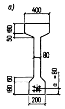 Принимаем 1 Æ 14 (Asр = 154 мм2). Пример 7. Дано: размеры сечения - b'f = 280 мм, h'f = 200 мм, b = 80 мм, h = 900 мм, a = 72 мм, a' = 40 мм; бетон тяжелый класса В30 (Rb = 15,5 МПа при gb2 = 0,9); напрягаемая арматура S класса А-IV (Rs = 510 МПа), площадью сечения Asр = 2036 мм2 (8 Æ 18); ненапрягаемая арматура S' класса А-III (Rsc = 365 МПа), площадью сечения A's = 226 мм2 (2 Æ 12); предварительное напряжение арматуры при gsp < 1: без учета потерь - ssp1 = 380 МПа, с учетом всех потерь - ssp2 = 320 МПа; потери по поз. 3 - 5 табл. 4 отсутствуют; натяжение арматуры механическое; изгибающий момент M = 790 кН×м. Требуется проверить прочность сечения. Расчет. h0 = 900 - 72 = 828 мм. Проверяем условие (37), принимая gs6 = 1: Rbb'fh'f + RscA's = 15,5×280×200 + 365×226 = 950500 Н < gs6RsAsp = 1×510×2036 = 1038400 H, т.е. условие (37) не соблюдается; при gs6 > 1 это условие тем более не будет соблюдаться и, следовательно, граница сжатой зоны проходит в ребре, а прочность сечения проверяем согласно п. 3.13б. Из формулы (38) определим значение