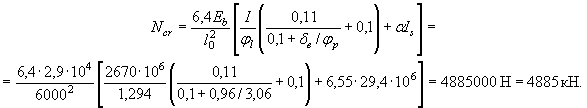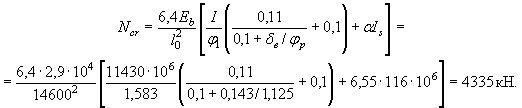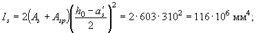 ysp = y0 - ap = 206,7 - 35 = 171,7 мм; ys = y0 - as = 206,7 - 20 = 186,7 мм; y¢s = h - a¢s - y0 = 300 - 20 - 206,7 = 73,3 мм. Момент инерции приведенного сечения: Ired = I + aAspy2sp + aAsy2s + aA¢sy¢2s = 730×303/12 + 730×30(285 - 206,7)2 + 50×2703/12 + 50×270(206,7 - 135)2 + 60×2703/36 + 60×270×0,5(206,7 - 180)2 + 15×97,53/12 + 15×97,5(206,7 - 48,7)2 + 7,4×201×171,72 + 7,4×50,3×186,72 + 7,4×50,3×73,32 = 3599×105 мм4. Из условия (3) п. 1.15 определим максимально допустимое значение ssp без учета потерь. При длине натягиваемого стержня l = 6 м