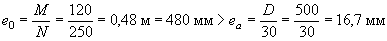 (момент от собственного веса не учитывается). Поскольку sbp/Rbp = 11,2/17,5 = 0,64 < 0,95 (см. табл. 7), требование п. 1.22 выполняется. Определим вторые потери напряжений по поз. 8 и 9 табл. 4. Потери от усадки равны s8 = 35 МПа. Потери от ползучести s9: на уровне арматуры S: отношение sbp/Rbp в целях упрощения расчета принимаем, как при определении s6, т.е. sbp/Rbp = 0,45; так как sbp/Rbp = 0,45 < 0,75, то s9 = 128a(sbp/Rbp) = 128×1×0,45 = 57,6 МПа; на уровне арматуры S': поскольку s¢bp < 0, то s6 = 0. Суммарная величина потерь напряжений: s1 + s6 + s8 + s9 = 15 + 15,3 + 35 + 57,6 = 122,9 МПа > 100 МПа, следовательно, согласно п. 1.18, потери не увеличиваем. Напряжение ssp2 с учетом всех потерь равно: ssp2 = 500 - 122,9 @ 377,1 МПа. Усилие от обжатия с учетом всех потерь напряжений P2 определяем по формуле (8), принимая напряжение ss равным сумме потерь от усадки и ползучести, т.е. ss = 15,3 + 35 + 57,6 = 107,9 МПа. Поскольку s¢bp < 0, s¢s = 0, то P2 = ssp2Asp - ssAs = 377,1×201 - 107,9×50,3 = 70370 Н. Эксцентриситет усилия P2 равен: