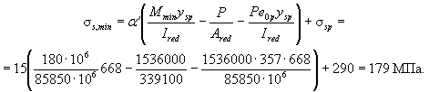 Проверяем выносливость растянутой арматуры из условия (151). Определяем наибольшие и наименьшие напряжения ss,max и ss,min на уровне растянутой арматуры по формуле (152):