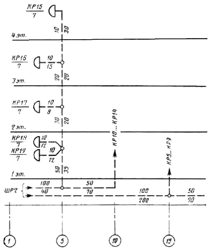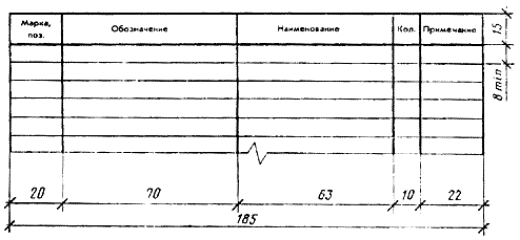 Постановлением Государственного комитета СССР по делам строительства от 31 октября 1980 г. № 172 срок введения установлен с 01.07 1981 г. Несоблюдение стандарта преследуется по закону Настоящий стандарт устанавливает состав и правила оформления рабочих чертежей и сигнализации для предприятий, зданий и сооружений всех отраслей промышленности и народного хозяйства. 1. ОБЩИЕ ПОЛОЖЕНИЯ1.1. Рабочие чертежи связи и сигнализации выполняют в соответствии с требованиями настоящего стандарта и других стандартов системы проектной документации для строительства. 1.2. В состав рабочих чертежей связи и сигнализации входят: рабочие чертежи, предназначенные для производства монтажных работ (основной комплект рабочих чертежей марки СС); чертежи общих видов нестандартных (нетиповых) конструкций; ведомость потребности в материалах. 1.3. В состав основного комплекта рабочих чертежей марки СС включают: общие данные по рабочим чертежам; спецификацию; схемы систем связи и сигнализации (далее именуются системами); планы систем. 1.4. Основной комплект рабочих чертежей марки CС допускается расчленять на части по признакам, установленным ГОСТ 21.101-79, и по следующим дополнительным признакам: по видам связи и сигнализации; по составным частям систем связи и сигнализации (например: станционная часть, линейная часть, наружные и внутренние сети); по зданиям и сооружениям. В этом случае в обозначение основных комплектов рабочих чертежей к марке СС следует добавлять порядковый номер, например, СС1, СС2. 1.5. Графические изображения оборудования, устройств, кабелей, проводов и других элементов систем на схемах и планах выполняют в соответствии с ГОСТ 2.701-76. На схемах и планах систем, включающих изображения нескольких одинаковых элементов (например: расположение сетей в помещениях, подключение проводов, аналогичная установка оборудования), допускается выполнять полное изображение одного элемента, а остальное - упрощено со ссылкой на полное изображение. Пример выполнения схемы расположения с повторяющимися элементами сети приведен на черт. 1. Схема расположения сетей по осям 10 и 15 аналогична расположению сети, показанной по оси 5. Черт. 1 2. ОБЩИЕ ДАННЫЕ ПО РАБОЧИМ ЧЕРТЕЖАМ2.1. В общих указаниях, которые входят в состав общих данных по рабочим чертежам марки СС, в дополнение к сведениям, предусмотренным ГОСТ 21.102-79, приводят: схемы, разъясняющие основные принципы организации связи и сигнализации на объекте (при необходимости); особые требования к системам (например: обеспечение взрывобезопасности, кислотостойкости); требования к монтажу систем. 3. СПЕЦИФИКАЦИЯ3.1. Спецификацию выполняют по форме 1, приведенной на черт. 2. 3.2. Спецификация состоит из разделов, наименование которых определяется видами связи и сигнализации. Наименование каждого раздела указывают в виде заголовка в графе «Наименование» и подчеркивают. 3.3. Запись элементов в каждом разделе производят в следующей последовательности: станционное оборудование; линейное оборудование; абонентские устройства; установочные изделия и разъемы; кабели и провода. Конструкция и монтажные изделия, а также материалы записывают отдельными разделами после разделов по видам связи. В спецификацию не включают вспомогательные монтажные изделия и материалы. 3.4. В графах спецификации указывают: в графе «Марка, поз.» - условные ма