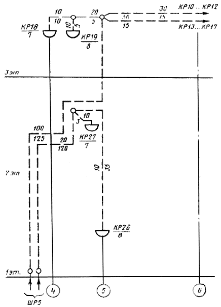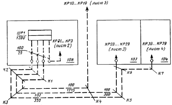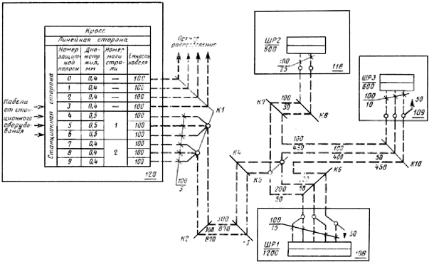 Черт. 4 4.3. Схемы или таблицы (монтажные) соединений 4.3.1. Схемы или таблицы соединений разрабатывают на станционную часть систем. 4.3.2. В схемах или таблицах соединений допускается приводить сведения о трассах и способах прокладки кабелей. 4.3.3. При разработке коммутационных соединений оборудования в дополнение к схемам или таблицам соединений допускается разрабатывать схемы или таблицы подключений. 4.4. Схемы расположения сетей 4.4.1. Схемы расположения сетей разрабатывают на линейную часть систем. 4.4.2. На схеме расположения сетей указывают: оборудование, его тип; кабели и провода, их марки и длины в метрах, муфты кабельные; таблицы занятости кабелей; номера или наименования зданий (сооружений) по генеральному плану. Оборудованию на схемах расположения допускается присваивать буквенно-цифровые обозначения. 4.4.3. Схему расположения телефонной сети допускается разделять на схему расположения магистральной сети и схему расположения распределительной сети. 4.4.4. На схеме расположения магистральной сети указывают линейную часть кросса телефонной станции, телефонные распределительные шкафы, магистральные кабели, кабели передач между шкафами и кабели прямого распределения (черт. 5.) Черт. 5 К схеме выполняют таблицы занятости кабелей, в которых указывают: количество абонентских устройств по видам связи; количество занятых пар; принятую емкость кабеля на данном участке в парах; процент запаса емкости кабеля. 4.4.5. Схему расположения распределительной сети разрабатывают на каждый шкафной район, здание или сооружение. 4.4.6. На схеме расположения распределительной сети шкафного района (черт. 6) приводят сведения в соответствии с п. 4.4.2. В таблице указывают данные о распределении и занятости боксов в шкафу (например, расположение и нумерацию магистральных, распределительных боксов и адрес прокладки кабеля). Черт. 6 4.4.7. Распределительные сети на схемах расположения указывают от распределительных шкафов или ввода в здание (сооружение) до оконечных распределительных устройств (черт. 7). Черт. 7 Схему расположения распределительной сети выполняют с учетом размещения абонентов в здании или сооружении. Допускается у распределительных устройств указывать их позиционное обозначение и количество занятых пар. При скрытой прокладке сетей на схеме расположения допускается показывать абонентские линии и абонентские устройства, их количество и места установки. 4.4.8. На схеме расположения воздушной линии связи указывают: профиль и высоту опор, длины пролетов между ними; место подвески проектируемых и существующих проводов; марки проводов и тип системы уплотнения. 4.5. Схема расположения телефонной канализации 4.5.1. На схеме расположения телефонной канализации указывают: контуры зданий или сооружений с учетом их взаимного расположения в соответствии с генеральным планом; номер или наименование зданий или сооружений; телефонную канализацию, смотровые устройства, расстояния между ними и количество каналов. При реконструкции на схеме указывают: количество докладываемых каналов; тип переоборудуемых смотровых устройств; сечения телефонной канализации с указанием расположения кабелей в существующих и докладываемых каналах. 4.6. Схемы расположения устройств 4.6.1. Схемы расположения устройств разрабатывают на станционную и линейную части сетей телефо