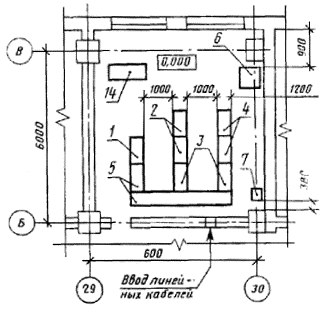 1. Поз. 6 и 7 закрепить на стене, отметка низа приборов +1,300 от уровня чистого пола помещения. 2. Общие технические требования к монтажу см. - (номер чертежа). Черт. 8 Допускается указывать шифры или наименования оборудования в их изображении или рядом. 5.3. Планы расположения конструкций для установки оборудования, прокладки и крепления кабелей 5.3.1. Планы расположения конструкций (черт. 9) разрабатывают в составе основных комплектов рабочих чертежей станционных и линейных частей систем связи и сигнализации.