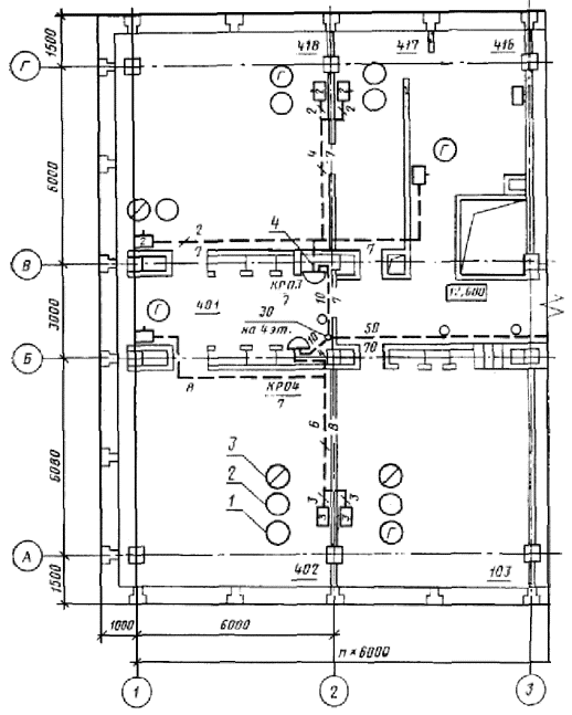 1. Поз. 4, 5 и 6 приварить к контуру сопрягаемых поверхностей, катет шва 5 мм. 2. В местах прокладки труб через стены предусмотреть проемы 500´500 мм, низ на отметке +1,500 от уровня чистого пола помещения. Черт. 9 5.3.2. На планах расположения конструкций, кроме элементов, перечисленных в п. 5.1.4, указывают: стойки, рамы, трубопроводы, лотки, полки и другие конструкции с установочными размерами и привязками; сведения об используемых и демонтируемых конструкциях. Допускается на основных направлениях указывать сечения труб с проставлением количества кабелей. 5.4. Планы расположения сетей 5.4.1. Планы расположения сетей разрабатывают в составе основного комплекта рабочих чертежей линейной части систем связи и сигнализации (при необходимости). 5.4.2. На планах расположения сетей, кроме элементов, перечисленных в п. 5.1.4, указывают: распределительные и абонентские устройства, кабели и провода, их типы, количество, марки и муфты кабельные; способ прокладки кабелей и проводов (по стене, в полу, в стояке, лотках, трубах); установочные размеры и привязки. Сечения трасс допускается указывать в таблице с проставлением количества кабелей, порядка их размещения и способа прокладки. Участки абонентских линий от оконечных распределительных устройств до абонентских допускается не указывать. В этом случае около абонентских устройств указывают номер распределительного устройства, в которое они включаются. Пример выполнения плана расположения телефонной сети приведен на черт. 10. 3-й этаж Распределительные кабели проложить в полу, телефонные коробки установить на высоте 1,5 м от пола в шкафах, телефонные розетки установить в нишах; абонентские линии проложить в плинтусе. Черт. 10 5.5. Планы расположения антенных устройств 5.5.1. Планы расположения антенных устройств разрабатывают в составе основного комплекта рабочих чертежей линейной части систем связи. 5.5.2. На планах расположения антенных устройств указывают: антенную опору с указанием установочных размеров и привязок; ввод антенного фидера, способ его прокладки, установочные размеры и привязки. 5.6. Планы расположения контуров заземления 5.6.1. Планы расположения контуров заземления разрабатывают в составе основных комплектов рабочих чертежей станционных и линейных частей систем связи и сигнализации. 5.6.2. На планах расположения внешних контуров заземления указывают: здания, в которых размещено станционное оборудование, ввод заземления и здание, его установочные размеры и привязки; расположение электродов заземления, расстояния между ними, соединения между электродами; назначение заземлений. План расположения контуров заземления выполняют в масштабе генерального плана с использованием его в качестве подосновы. 5.6.3. На планах расположения внутренних контуров заземления, кроме элементов, приведенных в п. 5.1.4, указывают расположение шин и щитков заземления. План расположения внутренних контуров заземления допускается совмещать с планом расположения оборудования или конструкций. 5.7. Планы расположения трасс телефонной канализации и подземных кабелей 5.7.1. Планы расположения трасс телефонной канализации и подземных кабелей разрабатывают в составе основного комплекта рабочих чертежей линейной части систем связи. 5.7.2. На планах указывают: телефонную канализацию; смотровые устройства, их тип, номер, количество 