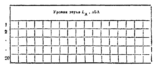 Расчет эквивалентного уровня звука LАэкв, дБА, в этой точке производят в следующей последовательности. 1. Измеренные уровни звука распределяют по интервалам, указанным в графе 1 формы 4. Так, например, уровень звука, равный 52 дБА, относят к интервалу от 48 до 52 дБА. Отсчеты уровней звука в каждом интервале заносят в графу 2 формы 4 в виде отметок. 2. Подсчитанное число отсчетов уровней звука в каждом интервале заносят в графу 3 формы 4. 3. По табл. 2 с зависимости от числа отсчетов определяют частные индексы для каждого интервала уровней звука и заносят их в графу 4 формы 4. Так, например, в интервале 43 - 47 дБА произведено 40 отсчетов уровней, звука. Соответствующий частный индекс равен 386. 4. Подсчитывают суммарный индекс. В рассматриваемом примере суммарный индекс равен 21705. 5. По табл. 3 определяют величину DLA, дБА, в зависимости от полученного суммарного индекса. Если значение полученного суммарного индекса отсутствует в табл. 3, величину DLA определяют для суммарного индекса, ближайшего по величине к данному суммарному индексу.
