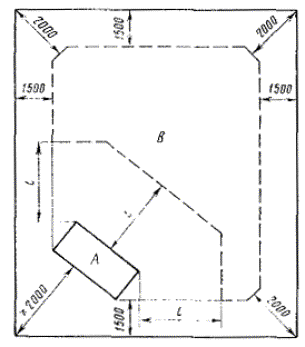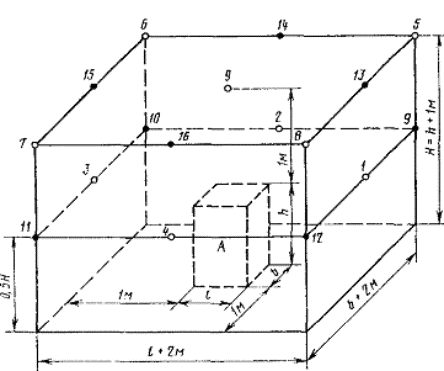 2. АППАРАТУРА2.1. Измерения уровней звукового давления в октавных полосах частот следует проводить шумомером 1 или 2-го класса по ГОСТ 17187-81 с подключенными к нему октавными электрическими фильтрами по ГОСТ 17168-81 или измерительной аппаратурой, в которую входят: измерительный микрофон, спектрометр, самописец уровня или измерительный магнитофон. (Измененная редакция. Изм. № 1) 2.2. Технические и метрологические характеристики аппаратуры, применяемой для измерений, должны удовлетворять требованиям ГОСТ 17168-81, ГОСТ 17187-81, ГОСТ 12.1.025-81 (СТ СЭВ 3080-81), приложение 1. (Измененная редакция. Изм. № 1) 2.3. Аппаратура, применяемая для измерений, должна иметь свидетельства о государственной или ведомственной поверке, проведенной по ГОСТ 8.002-71. 2.4. Калибровку аппаратуры следует проводить в соответствии с инструкциями к приборам до и после измерений. Если результаты калибровки отличаются между собой, то измерения следует повторить. 2.5. В качестве источника шума следует использовать оборудование, на которое устанавливается кожух, или образцовый механический источник шума, удовлетворяющий требованиям ГОСТ 12.1.025-81 (СТ СЭВ 3080-81), приложение 1. (Измененная редакция. Изм. № 1) 2.6. Предельное отклонение наибольшего и наименьшего габаритных размеров образцового источника шума от соответствующих наибольшего и наименьшего размеров оборудования, для которого предназначен испытываемый кожух, должно составлять не более ±20%. 2.7. Коэффициент звукопоглощения пола помещения или поверхности открытой площадки для измерения звукоизоляции кожухов в свободном звуковом поле должен быть не более 0,10 в диапазоне 63 - 8000 Гц. Методика проверки условий свободного звукового поля приведена в обязательном приложении 2. 2.8. Средний коэффициент звукопоглощения в помещениях для измерения звукоизоляции кожухов в отраженном звуковом поле должен быть не более 0,10 в диапазоне 63 - 8000 Гц. Отношение наибольшего внутреннего размера помещения для измерения звукоизоляции кожухов в отраженном звуковом поле к наименьшему должно быть не более 4:1. Методика проверки условий отраженного звукового поля приведена в обязательном приложении 3. Для помещений объемом от 200 до 1000 м3, имеющих средний коэффициент звукопоглощения не более 0,10 в диапазоне 63 - 8000 Гц и отношение наибольшего внутреннего размера к наименьшему не более 4:1, проверка условий отраженного звукового поля не требуется. 3. УСЛОВИЯ ИЗМЕРЕНИЙ3.1. При измерении звукоизоляции кожухов в свободном звуковом поле или на месте эксплуатации кожуха точки измерения должны располагаться в соответствии с черт. 1. 3.2. При измерении звукоизоляции кожухов в отраженном звуковом поле точки измерения должны размещаться в помещении равномерно на расстоянии не менее 1,5 м от ограждающих конструкции и не менее 2 м от углов помещения. Расстояние между точками измерения должно быть не менее 1 м. Расстояние между кожухом и точками измерений должно быть не меньше наибольшего линейного размера кожуха. Высота точек измерения должна быть не менее 1,5 м от пола помещения. Зона размещения точек измерения и кожуха приведена на черт. 2. Если эта разность равна 10 дБ и более, то влияние помех не следует учитывать. 3.4. Оборудование, закрываемое кожухом, должно быть установлено на горизонтальную поверхность в соответствии с нормативно-технической документацией на его изготовлен