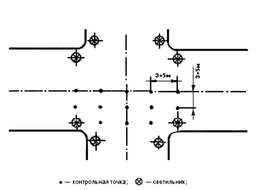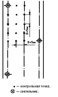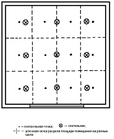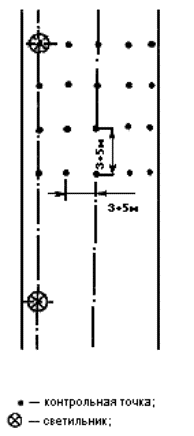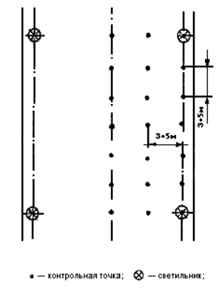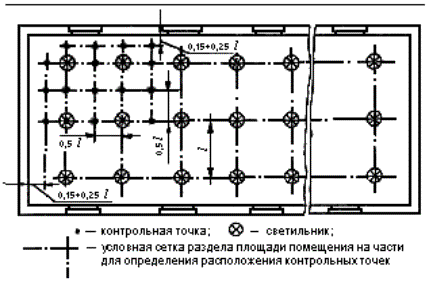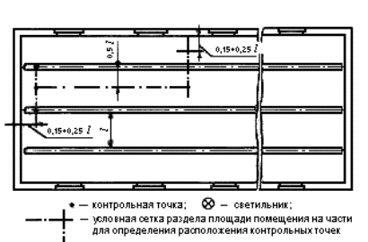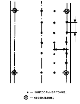 где Sn - площадь помещения, м2; Sк - площадь квадрата, м2. 5.6.3 При размещении контрольных точек на плане помещения их сетка не должна совпадать с сеткой размещения светильников. В случае совпадения сеток число контрольных точек на плане помещения целесообразно увеличить (рисунок А.3). При расположении в помещении крупногабаритного оборудования контрольные точки не должны располагаться на оборудовании. Если контрольные точки попадают на оборудование, сетку контрольных точек следует сделать более частой и исключить точки, попадающие на оборудование. 5.7 Размещение контрольных точек при измерении цилиндрической освещенности помещений 5.7.1 Контрольные точки для измерения цилиндрической освещенности следует размещать равномерно по помещению под светильниками, между светильниками и на центральной продольной оси помещения на высоте 1,5 м над полом и на расстоянии не менее 1,0 м от стены. 5.7.2 Число контрольных точек для измерения цилиндрической освещенности должно быть не менее 5. 5.8 Размещение контрольных точек при измерении минимальной освещенности помещений в местах производства работ вне зданий 5.8.1 Контрольные точки размещают на рабочих местах, по пути движения работающих. На освещаемой площади, ограниченной опорами, контрольные точки выбирают в центрах между опорами. При охранном освещении контрольные точки располагают по периметру освещаемой территории. 5.8.2 Число контрольных точек на освещаемом участке или по периметру освещаемой территории должно быть не менее 5. 5.9 Размещение контрольных точек при измерении средней освещенности улиц, дорог, площадей и тоннелей 5.9.1 Контрольные точки для измерения средней освещенности улиц, дорог и площадей должны располагаться равномерно на участке дорожного покрытия, ограниченном шагом светильников, на расстоянии 3 - 5 м друг от друга. 5.9.2 Контрольные точки для измерения средней освещенности тоннелей должны располагаться на дорожном покрытии на расстоянии 3 - 5 м друг от друга: - при вечернем и ночном режимах - на участках, ограниченных шагом работающих в данных режимах светильников; - при дневном режиме - на последовательных участках, ограниченных расстояниями от въездного портала, на которых согласно СНиП 23-05-95 нормируется средняя освещенность. 5.9.3 Число контрольных точек должно быть не менее 15. Примеры расположения контрольных точек при различном расположении светильников приведены на рисунках А.4 - А.10. 5.10 Размещение контрольных точек при измерении естественной освещенности помещений 5.10.1 Контрольные точки размещают на пересечении вертикальной плоскости характерного разреза помещения и условной рабочей поверхности (или пола). Первую и последнюю точки принимают на расстоянии 1 м от поверхности наружных стен и внутренних перегородок (или оси колонн). 5.10.2 Число контрольных точек должно быть не менее 5. В число контрольных точек должна входить точка, в которой нормируется освещенность согласно действующим нормам. 6 Проведение измерений6.1 Измерение освещенности от искусственного освещения6.1.1 Измерение освещенности при рабочем и аварийном освещениях следует производить в темное время суток, когда отношение естественной освещенности к искусственной составляет не более 0,1, измерение освещенности при эвакуационном освещении - когда значение естественной освещенности не превышает 0,1 