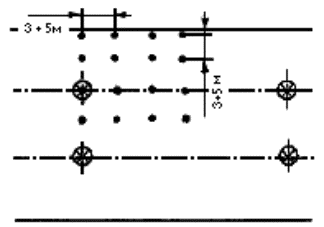 Рисунок А8 - Расположение контрольных точек при измерении средней освещенности улиц при осевом двухрядном расположении светильников