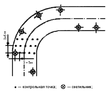 Рисунок А9 - Расположение контрольных точек при измерении средней освещенности улиц на перекрестке Рисунок А10 - Расположение контрольных точек при измерении средней освещенности улиц в местах закругления Приложение Б(рекомендуемое) Протоколы измеренийПротокол измерений освещенности в производственных и общественных помещениях