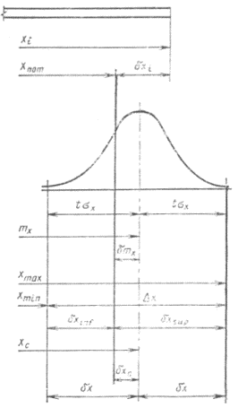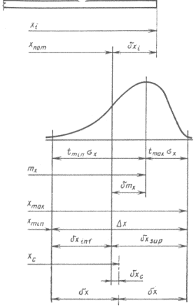 Постановлением Государственного комитета СССР по делам строительства от 2 декабря 1980 г. № 184 срок введения установлен с 01.07.1981 г. Настоящий стандарт распространяется на проектирование и строительство зданий и сооружений, а также на проектирование и изготовление строительных конструкций, деталей и изделий для них и устанавливает основные характеристики точности и основные положения по назначению, технологическому обеспечению, контролю и оценке точности геометрических параметров, обеспечивающие соблюдение функциональных требований к зданиям, сооружениям и их отдельным элементам на всех этапах строительного проектирования и производства. Установленные настоящим стандартом основные положения развиваются комплексом стандартов Системы обеспечения точности геометрических параметров в строительстве. В соответствии с требованиями стандартов Системы во вновь разрабатываемых и пересматриваемых стандартах и других нормативно-технических документах на конкретные элементы и конструкции зданий и сооружений, на рабочих чертежах и в технологической документации устанавливают требования к точности конструкций, их элементов и выполнения работ, а также методы и средства технологического обеспечения и контроля точности. Применяемые в стандарте термины и их определения приведены в приложении 1. Стандарт соответствует СТ СЭВ 2045-79 в части, указанной в приложении 2. 1. ХАРАКТЕРИСТИКИ ТОЧНОСТИ1.1. Точность геометрического параметра х, представляющего собой случайную величину, определяют характеристиками точности. При этом точность угловых величин может быть охарактеризована точностью линейных размеров, которыми определяются эти величины. Характеристики точности геометрических параметров в строительстве и их взаимосвязь указаны на черт. 1. Характеристики точности геометрического параметра 1.2. Точность геометрического параметра х в каждом отдельном случае характеризуется значением действительного отклонения dхi, выражаемого зависимостью где xi - действительное значение параметра х; xnom - номинальное значение параметра. Действительное отклонение dхi является количественным выражением систематических и случайных погрешностей, накопленных при выполнении технологических операций и измерений. 1.3. Точность геометрических параметров в стандартах и других нормативных документах, а также на рабочих чертежах характеризуется минимальным xmin и максимальным xmax предельными размерами, нижним dxinf и верхним dxsup предельными отклонениями от номинального xnom значения, допуском Dx и отклонением dxc середины поля допуска xc от номинального xnom значения параметра x. Половина допуска dx = Dx/2 является предельным отклонением параметра х от середины поля допуска xc. Взаимосвязь между этими характеристиками точности определяют по формулам: xmin = xnom + dxinf = xc - dx, (2) xmax = xnom + dxsup = xc + dx, (3) Dx = 2dx = xmax - xmin = dxsup - dxinf, (4) Примечание. Значения нижнего и верхнего предельных отклонений dxinf и dxsup подставляют в формулы со своими знаками. 1.4. Точность геометрического параметра х в совокупности его действительных значений xi, полученной в результате выполнения определенного технологического процесса или операции массового и серийного производства, определяют статистическими характеристиками точности. В качестве статистических характеристик точности геометрического па