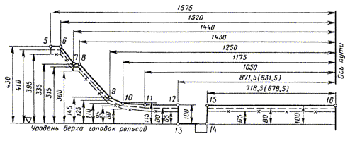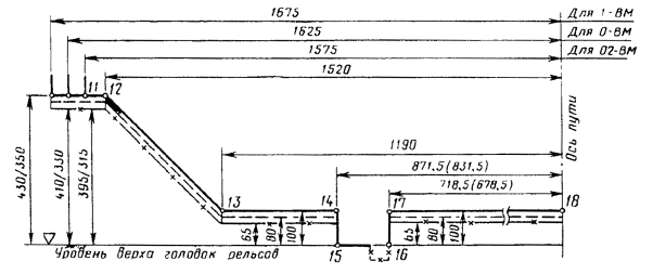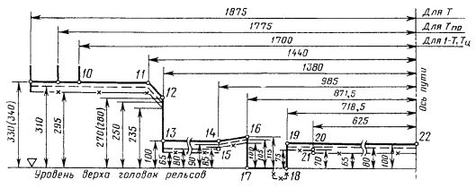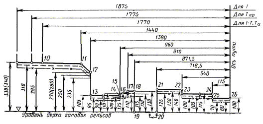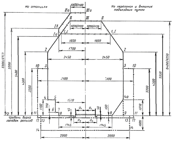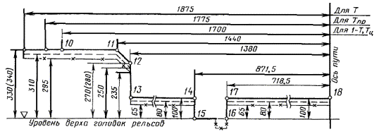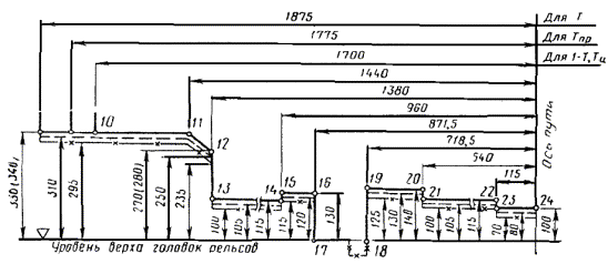 ¾¾¾¾¾ линия приближения пролетных строений мостов, конструктивных элементов тоннелей, галерей, платформ, настилов переездов, индукторов локомотивной сигнализации, механизмов стрелочных переводов и расположенных в их пределах устройств сигнализации, централизации и блокировки (СЦБ), а также сооружений и устройств, располагаемых на междупутьях станций в соответствии с п. 2.10; ¾¾о¾¾ линия приближения всех вновь строящихся сооружений и устройств, кроме расположенных на путях, электрификация которых исключена даже при электрификации данного участка железнодорожной линии, в том числе: I-II-III - для перегонов, а также путей на станциях (в пределах инженерных сооружений)*, на которых не предусматривается технологическая стоянка подвижного состава; Iа-Iб-IIа-IIIa - для остальных путей станций. Размеры, показанные в виде дроби, означают: в числителе - для контактной подвески с несущим тросам, в знаменателе - без несущего троса; * В настоящем стандарте: для раздельных пунктов с путевым развитием (станций, разъездов и обгонных пунктов) применяется общий термин «станции», под инженерными сооружениями следует понимать мосты (в том числе пешеходные), виадуки, акведуки, эстакады, путепроводы, тоннели, подпорные стенки, а также галереи и другие противообвальные и противолавинные сооружения, за исключением мест, где по характеру требований необходимо указывать точно, о каких именно раздельных пунктах или инженерных сооружениях идет речь. ¾¾×¾¾ линия приближения сооружений и устройств для путей, электрификация которых исключена даже при электрификации данного участка железнодорожной линии; ¾¾·¾¾ линия приближения зданий, сооружений и устройств (кроме пролетных строений мостов, конструктивных элементов тоннелей, галерей, платформ), расположенных с внешней стороны крайних путей перегонов и станций, а также у отдельно лежащих путей на станциях; ¾¾· ·¾¾ линия, выше которой на перегонах и в пределах полезной длины путей на станциях не должно подниматься ни одно устройство, кроме инженерных сооружений, настилов переездов, индукторов локомотивной сигнализации, а также механизмов стрелочных переводов и расположенных в их пределах устройств СЦБ; ¾· · ·¾ линия приближения фундаментов зданий и опор, подземных тросов, кабелей, трубопроводов и других, не относящихся к пути сооружений на перегонах и станциях, за исключением инженерных сооружений и устройств СЦБ в местах расположения сигнальных и трансляционных точек; · · · · · · · · · линия приближения конструктивных элементов тоннелей, перил на мостах, эстакадах и других инженерных сооружениях. Черт. 1 2.1.5. Расстояние (3100 мм) от оси пути до линии приближения зданий, сооружений и устройств (¾¾¾·¾¾¾) в трудных условиях* допускается при соответствующем обосновании и по разрешению министерства или ведомства, в ведении которых находятся железнодорожные пути, уменьшать, но принимать не менее: 2750 мм - до внутреннего края опор контактной сети, мачт светофоров и семафоров, подпорных стенок на перегонах и 2450 мм - на станциях; 1920 мм - до выступающих частей карликовых светофоров при высоте их не более 1100 мм (от уровня верха головок рельсов). При этом в местах установки опор, мачт и отдельно стоящих столбов на расстоянии от оси пути менее 3100 мм горизонтальные размеры 3100 и 2900 мм, указанные для точек 10 - 14, должны быть соотв