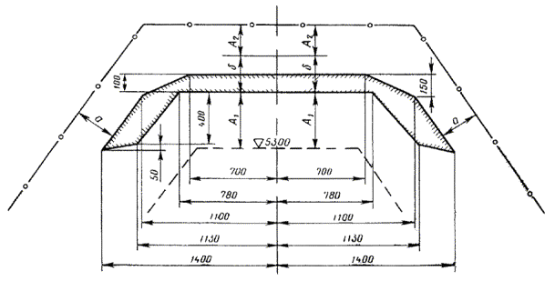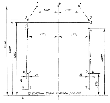 Примечания: 1. Размеры зазоров, показанные без скобок, следует применять во всех случаях, когда переустройство существующих сооружений под электрическую тягу не связано с экономически нецелесообразными затратами или длительными перерывами движения, для напряжения в контактном проводе 25 кВ или другого максимально возможного на рассматриваемой железнодорожной линия в перспективе, если применение на ней напряжения 215 кВ исключено. 2. Размеры зазоров, приведенные в скобках, допускается применять для существующих инженерных сооружений только в исключительных случаях при соответствующем обосновании и с разрешения министерства или ведомства, в ведении которых находятся железнодорожные пути. 2.3.2. Во избежание не вызываемых необходимостью переделок существующих сооружений и устройств при переустройстве их под электрическую тягу углы, образующиеся при построении линии ¾¾о¾¾ верхнего очертания габарита приближения строений, следует закруглять с обеспечением воздушных зазоров а и А2. 2.3.3. Для внутренних путей промышленных и транспортных предприятий, расположенных под капитальными инженерными сооружениями, ограничивающими габарит, высоту подвески контактного провода по разрешению министерства или ведомства, утверждающих проект, допускается понижать учетом конструкции и размеров фактически обращающихся по этим путям типов подвижного состава. 2.3.4. При применении для путей промышленных и транспортных предприятий напряжения в контактной сети менее 1,5 кВ высота подвески контактного провода и величины воздушных зазоров между токонесущими частями контактной сети и заземленными частями инженерных сооружений должны устанавливаться проектом и утверждаться министерством или ведомством, в ведении которых находятся соответствующие пути. 2.3.5. При боковом токосъеме высоту подвески и вынос от оси пути контактного провода следует определять проектом в каждом отдельном случае в зависимости от местных условий, конструкции обращающихся типов подвижного состава и условий безопасности движения. 2.4. Нижние очертания габаритов С и Сп 2.4.1. Нижнее очертание габаритов приближения строений С и Сп для двойных перекрестных стрелочных переводов должно соответствовать указанному на черт.4. Нижнее очертание габаритов С и Сп для двойных перекрестных стрелочных переводов