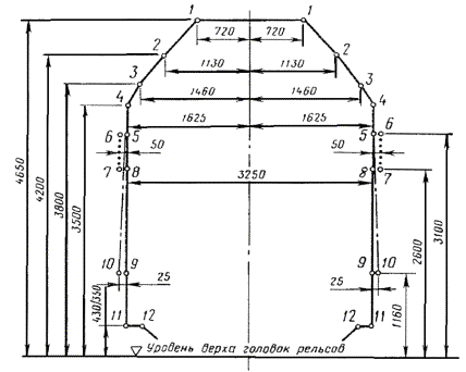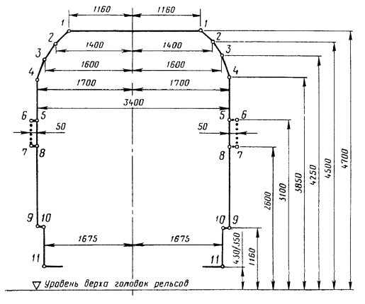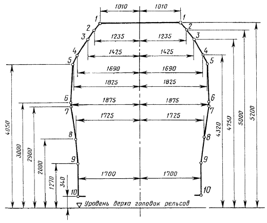 3.1.5. В интервале по высоте от 5200 до 5300 мм подвижной состав, проектируемый по габариту Тц, должен вписываться в очертание габарита подвижного состава 1-Т на этой высоте, показанное на черт. 10 сплошными линиями. 3.1.6. Верхнее очертание габарита подвижного состава Тпр должно соответствовать указанному на черт. 9. 3.1.7. До переустройства соответствующих сооружений и устройств, не удовлетворяющих габариту Тпр, разрешается использовать полную ширину этого габарита для вписывания подвижного состава в пределах очертания, ограниченного сверху линией 3-3 (до высоты 4350 мм). Выше линии 3-3 подвижной состав должен вписываться в очертание габарита 1-Т, показанное на черт.10 сплошными линиями. 3.1.8. Верхнее очертание габарита подвижного состава 1-Т должно соответствовать указанному на черт. 10. 3.1.9. Строительная ширина подвижного состава, проектируемого по габариту 1-Т, в пределах интервала по высоте между точками 8 и 10, не должна быть более 3250 мм. Если по расчету согласно разд. 4 она получается менее 3250 мм, то в качестве строительного размера принимается расчетный. 3.2. Нижние очертания габаритов Т, Тц, Тпр, 1-Т 3.2.1. Нижние очертания габаритов подвижного состава Т, Тц, Тпр, 1-Т должны соответствовать указанным на черт.11. ГАБАРИТ Тпр Верхнее очертание габарита