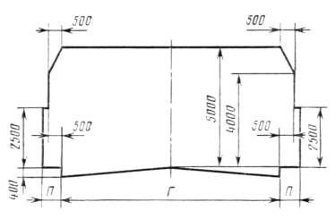 Для тоннелей длиной менее 100 м при технико-экономических обоснованиях, учитывающих условия сооружения тоннелей, интенсивность движения и состав транспортного потока, режим и условия безопасности движения, а также общее народно-хозяйственное значение и перспективу развития дорог, допускается расстояние Г между боковыми ограждающими устройствами принимать: на дорогах I и II категорий - 9500 мм, на дорогах III категории - 9000 мм. Примечания: 1. Для автомобильных дорог I категории на чертеже и в таблице размеры указаны для одного из направлений движения с двумя полосами проезжей части при устройстве раздельных тоннелей для каждого из направлений движения. При устройстве единого тоннеля для обоих направлений движения ширину разделительной полосы между смежными очертаниями габаритов или полосы для размещения опор следует определять расчетом; при этом ширина разделительной полосы должна быть не менее 1500 мм. 2. При числе полос движения более двух в каждом направлении, а также на участках расположения площадок для остановки автотранспортных средств приведенные в таблице расстояния Г между боковыми ограждающими устройствами необходимо увеличивать соответственно числу и ширине дополнительных полос движения и (или) ширине площадки для остановки автотранспортных средств. 4. Служебные проходы П принимаются для тоннелей, сооружаемых на дорогах I и II категорий, по обеим сторонам проезжей части; для тоннелей, сооружаемых на дорогах III и IV категорий, с одной стороны предусматривается устройство служебного прохода П, с другой защитной полосы З. Тротуары в тоннелях (однополосные шириной 1000 мм или двухполосные шириной 1500 мм) допускается устраивать только при соответствующих технико-экономических обоснованиях. 5. Габарит приближения строений и оборудования автодорожных тоннелей по высоте следует принимать 5000 мм. Габарит по высоте более 5000 до 6000 мм допускается принимать в случаях, когда размеры выработки при сооружении тоннеля, определяемые условиями рационального восприятия горного давления, а также конструкция тоннельной вентиляции позволяют применять этот габарит без увеличения объема выработки и стоимости сооружения тоннеля по сравнению с габаритом по высоте 5000 мм. 6. При расположении тоннелей на кривых участках дороги в плане с радиусом 1000 м и менее расстояние между боковыми ограждающими устройствами, указанное в таблице, следует увеличивать с внутренней стороны кривой в зависимости от ее радиуса согласно требованиям Строительных норм и правил по проектированию автомобильных дорог; верхнюю часть габарита тоннеля, расположенную над нишами для служебных проходов или тротуаров следует, кроме того, увеличивать с внутренней стороны кривой на величину дополнительного наклона транспортного средства h(iв - iп) (где h - высота автотранспортного средства, равная 4000 мм, iв - поперечный уклон проезжей части на вираже в данном поперечном сечении, iп - поперечный уклон проезжей части, принятый для прямых участков). 7. Установленные настоящим стандартом габариты приближения строений и оборудования по высоте должны соблюдаться в течение всего периода эксплуатации с учетом возможного изменения уровня проезжей части при укладке новых слоев дорожных покрытий взамен изношенных.