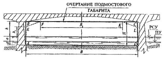 4.5 Очертание подмостового габарита должно быть прямоугольным (соответствовать указанному на рисунках 1 и 2 контуру АВСОА). На участках водных путей 1-4-го классов для неразводных пролетов мостов с криволинейным очертанием нижнего пояса пролетных строений, располагаемых в стесненных условиях (в пределах городов и подходов к ним, вблизи транспортных узлов, на автомобильных дорогах со сложными развязками на берегах и в других обоснованных случаях), допускается принимать очертание подмостового габарита по контуру AEFKLDA. При этом высоту h1, и ширину B1, устанавливают по согласованию с органами, регулирующими судоходство, но не менее, соответственно, 0,7h и 0,7В. 4.6 В неразводных пролетах допускается снижать ширину подмостового габарита В, м: - в пролете, предназначенном для движения плавучих средств только вниз по течению при отсутствии плотоперевозок на водных путях: 4-го класса - до 100; 5-го » - » 80; 6-го » - » 40; 7-го » - » 30; - в пролете, предназначенном для движения плавучих средств только вверх по течению при средней скорости течения в меженный период, превышающей 0,5 м/с, на водных путях: 1-го класса - до 120; 2-го » - » 100; 3-го и 4-го » - » 80. При этом очертание подмостового габарита должно быть только прямоугольным. ABCDA и АЕFКLDA - контуры подмостового габарита; РСУ - расчетный высокий судоходный уровень воды; ПУ - проектный уровень воды; Н - общая высота подмостового габарита; h - высота подмостового габарита над РСУ; В - ширина подмостового габарита; d - гарантированная глубина судового хода на перспективу; а - амплитуда колебаний уровней воды между РСУ и ПУ. Положение навигационных знаков условно не показано. Рисунок 1 - Подмостовой габарит неразводного судоходного пролога моста