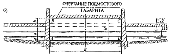 ABCDA - контур подмостового габарита; РСУ - расчетный высокий судоходный уровень воды; ПУ - проектный уровень воды; H - общая высота подмостового габарита; h - высота подмостового габарита над РСУ; В - ширина подмостового габарита; d - гарантированная глубина судового хода на перспективу; a - амплитуда колебаний уровней воды между РСУ и ПУ. Положение навигационных знаков условно не показано. Рисунок 2 - Подмостовой габарит разводного судоходного пролета моста а) - с раскрытием пролетного строения; б) - с вертикальным подъемом пролетного строения 4.7 Ширина подмостового габарита В может быть принята меньше указанной в таблице 2, если пролет моста полностью перекрывает суммарную ширину водного пути с береговыми полосами отвода с обеих сторон, находящимися в ведении органов речного транспорта. 4.8 Для мостов с разводными пролетными строениями, которые предназначены для пропуска только судов с большой надводной высотой, высоту Н устанавливают по согласованию с органами, регулирующими судоходство, и другими заинтересованными органами. При этом ее следует определять исходя из величины надводной высоты соответствующих судов или объектов, предназначенных для проводки в этом судоходном пролете. 4.9 Неразводные мосты должны иметь, как правило, не менее двух судоходных пролетов: отдельно для движения плавучих средств вниз по течению (от истока к устью) и вверх (против течения). Если в рассматриваемом створе ширина водного пути с гарантированными глубинами недостаточна для размещения двух судоходных пролетов, допускается предусматривать один судоходный пролет. При этом снижение под ним ширины подмостового габарита, указанное в 4.6, не допускается. 4.10 В наплавных мостах допускается устройство одного судоходного пролета. 4.11 В наплавных мостах ширину выводной части устанавливают в зависимости от класса водного пути с учетом гидрологических условий, а также условий эксплуатации флота, но не менее 1,5-кратной гарантированной ширины судового хода. 4.12 Отметку РСУ следует определять по методике, приведенной в приложении Б. 4.13 Для мостовых переходов через водные пути, по которым в полноводный период навигации возможен заход судов транспортного флота с водных путей более высокого класса, подмостовые габариты судоходных пролетов следует устанавливать по результатам комплексного технико-экономического обоснования, согласованного с департаментом речного транспорта транспортного министерства (ведомства), а при заходе судов с водных путей 1-го и 2-го классов - также с Министерством обороны (Главным штабом ВМФ и Штабом тыла ВС). 4.14 Мостовые переходы следует располагать на участках водных путей, удовлетворяющих следующим требованиям: а) русло реки должно быть устойчивым, позволяющим удерживать судовой ход без перемещений его по ширине реки и не допускающим изменения глубин, влияющих на судоходство; б) участок реки должен быть прямолинейным с достаточным удалением от перекатов, по возможности, без поймы или с высокой незначительно затопляемой поймой. Длина прямолинейного участка, а также расстояние от моста до перекатов должны быть, как правило, с верховой стороны не менее трех, а с низовой стороны - не менее полутора длин расчетного судового (плотового) состава; в) направление течения и ось судового хода должны быть, как правило, параллельны. Отклонен
