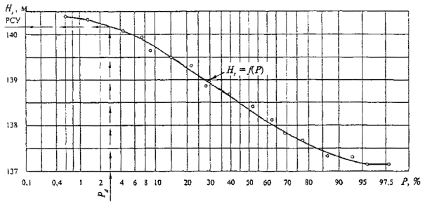 где m - порядковый номер уровня воды; n - число лет гидрометрических наблюдений. Б.1.5 На основе полученных знаний Ht и P строят график Ht=f(P), по которому определяют отметку РСУ в зависимости от расчетной вероятности превышения Рd, %, принимаемой равной: 2 - для водного пути 1-го класса, 3 - для 2-го класса, 4 - для 3 6 и 7-го классов, 5 - для 4-го и 5-го классов. Пример построения графика и определения по нему РСУ приведен на рисунке Б.1 Рисунок Б.1 - График для определения РСУ Б.1.6 При отсутствии материалов многолетних гидрометрических наблюдений в створе проектируемого мостового перехода отметку РСУ определяют для створа опорного гидрологического поста. Перенос отметки РСУ на створ мостового перехода следует производить на основе графика связи соответственных уровней воды, который вычерчивают по результатам наблюдений за уровнями воды в процессе выполнения изыскательских работ в створе мостового перехода. Б.1.7 Для определения РСУ малоизученных рек (когда материалы гидрометрических наблюдений отсутствуют или недостаточны но продолжительности) допускается использовать данные краткосрочных гидрометрических наблюдений с приведением их к многолетнему периоду поданным постов гидрометеослужбы, расположенных на реках-аналогах, удовлетворяющих следующим условиям: - возможная географическая близость расположения водосборов; - сходство климатических условий; - однородность условий формирования стока, однотипность почв (грунтов) и гидрогеологических условий, по возможности близкая степень озерности, залесенности, заболоченности и распаханности; - площади водосборов должны отличаться не более чем в 10 раз; - отсутствие факторов, существенно искажающих величину естественного речного стока (регулирование стока, сбросы, изъятие па орошение и другие нужды). Б.2 Определение РСУ для участков шлюзованных рек и водохранилищБ.2.1 Если на водном пути в продолжение всего периода навигации имеется подпор, создаваемый плотиной, а вода во время паводков пропускается через водосбросные устройства при отметках ниже нормального подпорного уровня (НПУ), то мост может быть расположен в одной из двух зон, указанных на рисунке Б.2: в первой зоне - когда отметка уровня паводка определенной вероятности превышения ниже отметки НПУ с учетом кривой подпора; во второй зоне - когда отметка уровня паводка определенной вероятности превышения выше отметки НПУ с учетом кривой подпора. Б.2.2 При расположении моста в первой зоне за РСУ принимают уровень, отметка которого не менее, чем на 0,5 м выше отметки НПУ водохранилища с учетом кривой подпора. 1 - плотина; 2 - нормальный подпорный уровень воды (НПУ); 3 - уровень паводка вероятностью превышения Рd, %, пропускаемого через водосливные отверстия плотины; 4 - уровень паводка до сооружения плотины. Рисунок Б.2 - Схема расположения зон Б.2.3 При расположении моста во второй зоне РСУ определяют в порядке, установленном в разделе 1 настоящего приложения. При этом: - коэффициент допускаемого снижения продолжительности физической навигации K принимают равным: 5 - для водных путей 1-го класса, 6 - для 2, 3, 6 и 7-го классов, 7 - для 4-го и 5-го классов; - расчетную вероятность превышения Рd, %, принимают равной: 2 - для водных путей 1-го класса, 3 - для 2-го класса, 4 - для 3-го класса, 5 - для 4-го и 5-го классов, 6 - для 6-го и 7-го классов. Если полученное значение РСУ имеет отм