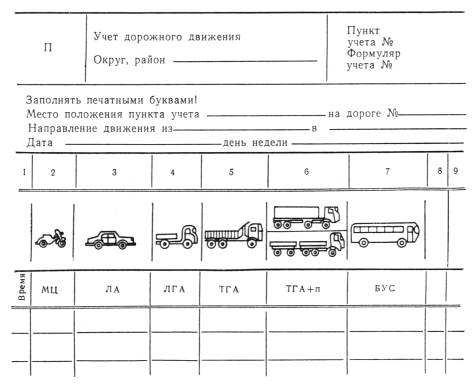 Примечание. Тракторы с прицепами и без прицепов могут учитываться в группах 3, 4, 5. 2.10. При проведении учета движения следует заполнять формуляры учета (черт. 2). Формуляр учета должен содержать данные о пункте учета (номер, положение, направление движения), сроках и продолжительности учета, а также о типах транспортных средств, подлежащих учету. Данные о количестве транспортных средств заносятся в формуляр с интервалом в 1 h и раздельно по направлениям движения. Свободные столбцы в формуляре учета могут использоваться для дальнейшего подразделения транспортных средств в пределах групп, а также для отдельного учета каких-либо избранных видов транспортных средств. Допускается применять другие формуляры учета, если различаемые в этих формулярах типы транспортных средств могут быть обобщены в группы, установленные в п. 2.8.