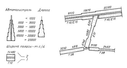 где А - количество дней учета (А равно четырем будним дням при минимальной продолжительности учета). 3.7. Кроме того, среднегодовую суточную интенсивность движения следует рассчитывать для следующих объединенных групп транспортных средств: 1) тяжелые транспортные средства ТТС = ТГА+ТГА+п+БУС; (5) 2) транспортные средства ТС = МЦ+ЛА+ЛГА+ТТС. (6) 3.8. Расчетную интенсивность движения для международных дорог следует определять как наибольшую интенсивность движения в час, достигаемую или превышаемую в течение 50 h в год учета. Ее необходимо рассчитывать по формуле N = Mmt×Kn, (7) где N - расчетная интенсивность движения, т.с./h; Kn - коэффициент пересчета среднегодовой суточной интенсивности движения в расчетную интенсивность движения. Коэффициент пересчета Kn определяют из проводимого в каждой отдельной стране базисного учета движения. Его определяют в зависимости от факторов отпускного и воскресного движения и указывают для каждой характеристики движения. 4. ОФОРМЛЕНИЕ РЕЗУЛЬТАТОВ УЧЕТА4.1. Результаты учета в поперечном сечении сводятся в таблицу и представляются графически на эпюре интенсивности движения. 4.2. В таблице следует указывать следующие данные для участков учета: 1) год учета и страна, в которой проводится учет; 2) номер дороги (международный и национальный); 3) номер пункта учета, длина участков учета; 4) коэффициенты неравномерности и характеристика движения; 5) среднегодовая суточная интенсивность движения для групп транспортных средств: мотоциклы, легковые автомобили, легкие грузовые автомобили, тяжелые грузовые автомобили, грузовые автомобили с прицепом, автобусы, а также для обобщенных групп: тяжелые транспортные средства и транспортные средства (количество транспортных средств в сутки); 6) доля групп транспортных средств в среднегодовой суточной интенсивности движения (в процентах); 7) расчетная интенсивность движения (количество транспортных средств в час); 8) доля тяжелых транспортных средств в расчетной интенсивности движения (количество транспортных средств в час и в процентах). Пример оформления результатов учета движения показан в табл. 3.