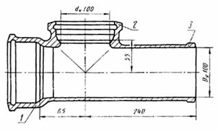 Масса тройника - 6,0 кг 1 - раструб типа I по ГОСТ 6942.2-80; 2 - раструб типа IV по ГОСТ 6942.2-80, 3 - хвостовик по ГОСТ 6942.2-80 Примечание. Размеры и масса даны без учета антикоррозионного покрытия. Условное обозначение прямого низкого тройника: Тройник ТН-100´100 ГОСТ 6942.14-80 3. Технические требования, правила приемки, методы контроля, маркировка, упаковка, транспортирование, хранение, гарантии изготовителя - по ГОСТ 6942.0-80. |