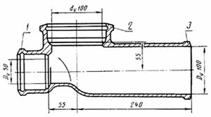 Масса тройника - 4,9 кг 1 - раструб типа I по ГОСТ 6942.2-80; 2 - раструб типа IV по ГОСТ 6942.2-80; 3 - хвостовик по ГОСТ 6942.2-80 Примечание. Размеры и масса даны без учета антикоррозионного покрытия. Условное обозначение прямого переходного низкого тройника: Тройник ТПРН-50/100´100 ГОСТ 6942.16-80 3 Технические требования, правила приемки, методы контроля, маркировка, упаковка, транспортирование, хранение, гарантии изготовителя - по ГОСТ 6942.0-80. |