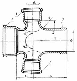 * a = 87°30' или 90°, при этом размер 87°30' является предпочтительным, а в крестовинах высшей категории качества - обязательным. 1 - раструбы типа I по ГОСТ 6942.2-80; 2 - хвостовик по ГОСТ 6942.2-80 Размеры в мм
