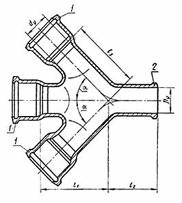 Постановлением Государственного комитета СССР по делам строительства от 4 сентября 1980 г. №137 срок введения установлен с 01.01.1982 г. 1. Настоящий стандарт распространяется на косые крестовины к чугунным трубам, предназначенным для систем внутренней канализации зданий. 2. Конструкция и размеры косых крестовин должны соответствовать указанным на чертеже и в таблице.