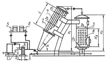 Постановлением Государственного комитета СССР по делам строительства от 26 апреля 1982 г. № 106 срок введения установлен с 01.01. 1983 г. 1. Настоящий стандарт распространяется на компактные установки заводского изготовления, работающие на реагентной (Р) и безреагентной (БР) схемам, предназначенные для очистки поверхностных вод с целью их использования в системах хозяйственно-питьевого водоснабжения. 2. Типы, основные размеры и параметры установок в зависимости от метода обработки воды и производительности должны соответствовать указанным в таблице и на чертеже. 3. Основными элементами установок являются: насосы подачи воды, трубчатый отстойник, скорый фильтр, сетчатый фильтр, блок обеззараживания воды и блок коагулирования воды. 4. Установки должны изготавливаться в соответствии с требованиями настоящего стандарта по рабочим чертежам, утвержденным в установленном порядке. 5. Для изготовления установок и при их эксплуатации должны применяться материалы и реагенты, разрешенные Минздравом СССР для применения в практике хозяйственно-питьевого водоснабжения. 1 - насосы подачи воды; 2 - трубчатый отстойник; 3 - скорый фильтр; 4 - сетчатый фильтр; 5 - блок коагулирования воды; 6 - блок обеззараживания воды; 7 - трубчатые элементы отстойника; 8 - загрузка скорого фильтра
