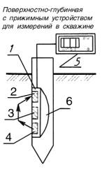 1 - измерительный преобразователь; 2 - источник гамма-излучения; 3 - экран; 4 - источник нейтронов; 5 - детектор гамма-излучения и нейтронов; 6 - измерительный прибор; 7 - детектор гамма-излучения; 8 - детектор нейтронов Черт. 4 2.11. При глубинных (скважинных) измерениях плотности, влажности в необсаженных скважинах или скважинах с переменным диаметром обсадных труб следует применять индикаторы диаметра (каверномеры и диаметромеры) в составе измерительного преобразователя плотномера, влагомера или влагоплотномера, или в виде отдельных преобразователей. Индикаторы диаметра (каверномеры или диаметромеры) должны обеспечивать возможность измерения диаметра скважин до 90+5 мм с погрешностью не более ± 2 мм при доверительной вероятности 0,95. 2.13. При поверхностно-глубинных измерениях плотности, влажности в скважинах следует применять прижимные устройства, обеспечивающие надежный контакт измерительного преобразователя со стенкой скважины (обсадной трубы), а также экранирующие устройства в составе измерительного преобразователя, обеспечивающие снижение влияния излучений, рассеянных от стенок скважины (трубы), до постоянных значений. 3. ПОДГОТОВКА И ПРОВЕДЕНИЕ ИЗМЕРЕНИЙ3.1. Для глубинных (скважинных) измерений плотности и (или) влажности следует пробурить скважину и (или) погрузить трубу. Скважина должна иметь диаметр не более 90 мм и не должна быть заполнена водой. При соединении отрезков труб не допускается применять муфтовые или ниппельные соединения. Отклонение диаметра скважины от принятого при градуировке прибора не должно быть более 2 мм при измерении плотности и не более 5 мм при измерении влажности. Отклонения толщины стенки от принятого при градуировке для стальных и титановых труб не должны быть более 0,5 мм для дюралевых и керамических труб - не более 1 мм. Трубы, погружаемые в грунт, должны иметь диаметр не более 90 мм, в том числе стальные и титановые со стенкой толщиной не более 6 мм, дюралевые и керамические со стенкой толщиной не более 10 мм. Трубы и их стыки должны быть водонепроницаемыми. При погружении обсадных труб в скважины труба должна входить в скважину. При измерениях следует применять обсадные трубы, материал и толщина стенки которых не отличаются от принятых при градуировке приборов. Рекомендуемые типоразмеры обсадных труб приведены в приложении 6. 3.2. При поверхностно-глубинных измерениях в скважинах (обсадных трубах) плотности или влажности диаметр скважины (трубы) должен быть не более 146 мм. Скважины (трубы) не должны быть заполнены водой. При измерении плотности грунта методами альбедо и альбедо-абсорбционным, а также при поверхностных и комбинированных измерениях влажности измерительный преобразователь, содержащий источник гамма-излучения или замедленных нейтронов, следует устанавливать на расчищенную и выровненную поверхность грунта. Опорная плоскость измерительного преобразователя должна быть плотно прижата (без зазора) к поверхности грунта. При измерении плотности альбедо-абсорбционным методом и влажности по комбинированной схеме блок источника ионизирующего излучения помещают (внедряют) в грунт на глубину, фиксируемую с погрешностью не более ± 0,5 мм. Расстояние между измерительным преобразователем плотномера (влагомера) от стенок сооружения или выработки должно быть более 500 мм. 3.3. Градуировку и ме