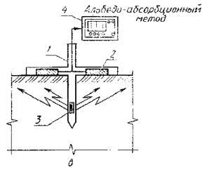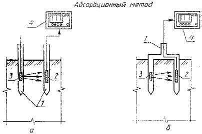 1 - измерительный преобразователь; 2 - детектор; 3 - защитный экран; 4 - радиоизотопный источник; 5 - измерительный прибор; 6 - прижимное устройство Черт. 1 2.6. При измерении плотности грунта абсорбционным методом применяют схему измерений с расположением источника ионизирующего излучения в одной скважине, а измерительного преобразователя - в другой (черт. 2а) с расстоянием между источником ионизирующего излучения и детектором преобразователя, фиксированным с погрешностью не более ± 0,5 %. Для послойного измерения плотности в объеме грунта между скважинами источник ионизирующего излучения и измерительный преобразователь могут быть размещены в жесткой конструкции (черт. 2б), погружаемой в грунт. 2.7. При измерении плотности грунта альбедо-абсорбционным методом применяют схему измерений (черт. 2в), при которой источник ионизирующего излучения погружают в грунт, а измерительный преобразователь помещают на поверхности грунта - для измерения средней плотности грунта в слое между источником ионизирующего излучения и измерительным преобразователем. 2.8. Нейтронные влагомеры и радиоизотопные влагоплотномеры должны обеспечивать возможность измерения объемной влажности в пределах от 2 до 100 % при глубинных измерениях и от 2 до (40 ± 10) % - в остальных случаях. Схемы измерений радиоизотопными плотномерами