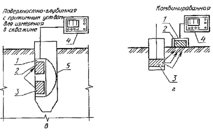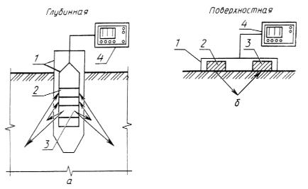 1 - измерительный преобразователь; 2 - детектор; 3 - радиоизотопный (нуклид) источник; 4 - измерительный прибор Черт. 2 2.9. При измерениях влажности грунта нейтронным методом применяют следующие схемы измерений (черт. 3): глубинную (скважинную) - измерительный преобразователь с источником нейтронов помещают в скважину по ее центру для измерения влажности грунта в радиусе вокруг измерительного преобразователя от 200 до 250 мм при объемной влажности (Wоб) 40 - 45 % и в радиусе до 450 мм при Wоб £ 5 %; поверхностную - измерительный преобразователь и источник нейтронов помещают на поверхности грунта для измерения влажности грунта в слое толщиной до 150 мм под измерительным преобразователем; поверхностно-глубинную - измерительный преобразователь и источник нейтронов прижимают к боковой поверхности скважины или обсадной трубы для измерения влажности в слое толщиной до 150 мм под измерительным преобразователем; комбинированную - измерительный преобразователь помещают на поверхности грунта, а источник нейтронов в грунте - для измерения влажности грунта в слое между источником нейтронов и измерительным преобразователем. 2.10. При одновременном измерении плотности и влажности грунта радиоизотопными влагоплотномерами применяют следующие схемы измерений (черт. 4): глубинную (скважинную) - измерительный преобразователь, содержащий детектор (детекторы) для одновременной или раздельной регистрации плотности потока гамма-излучения и замедленных нейтронов и источники гамма-излучения и медленных нейтронов, помещают в скважину по ее центру для измерения плотности грунта по п. 2.5 и влажности по п. 2.9; поверхностную - измерительный преобразователь устанавливается на поверхности грунта для измерения плотности и влажности грунта в слое толщиной до 150 - 200 мм под измерительным преобразователем; поверхностно-глубинную - измерительный преобразователь прижимают к боковой поверхности скважины или обсадной трубы для измерения плотности в слое толщиной до 120 мм и влажности грунта в слое толщиной до 150 мм под измерительным преобразователем; комбинированную - измерительный преобразователь помещают на поверхности грунта, а источники нейтронов и гамма-излучения погружают поочередно в грунт для измерения плотности и влажности грунта в слое между измерительным преобразователем и источником ионизирующего излучения. Схемы измерений нейтронными влагомерами
