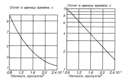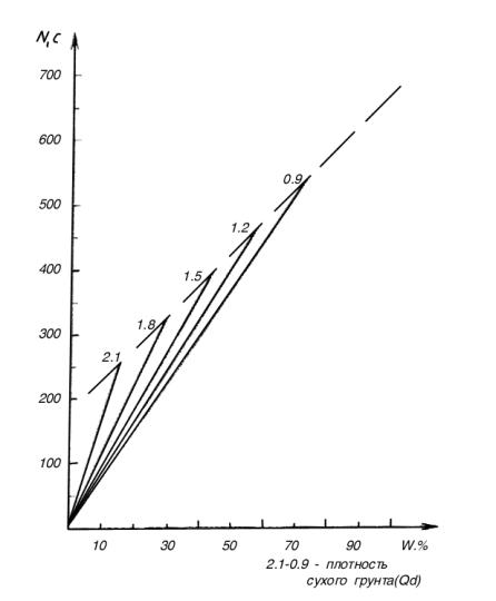 27. Градуировочную зависимость плотномера строят по средним значениям показаний прибора и результатам определения средней плотности грунта на участках градуировки. Градуировочную зависимость влагомера строят по средним значениям показаний приборов и результатам определения средней объемной влажности с учетом средней плотности сухого грунта на участках градуировки. На графики наносят средние значения плотности: сухого грунта участков градуировки, по которым строят градуировочные зависимости показаний влагомера от объемной влажности для различных (с интервалом 100 - 200 кг/м3). На градуировочных графиках или таблицах также указывают плотность частиц грунта на каждом участке градуировки. 28. Основную погрешность радиоизотопных плотномеров, нейтронных влагомеров оценивают путем сравнения показаний приборов и результатов определения плотности и объемной влажности образцов однородного грунта, отобранных на участке измерений в условиях, соответствующих условиям градуировки и массовых измерений радиоизотопными плотномерами, влагоплотномерами, нейтронными влагомерами. Оценку основной погрешности приборов при измерении плотности и влажности следует выполнять на участках (в слоях грунта, размеры и степень однородности которых соответствуют пп. 22 - 24 настоящего приложения). Измерения плотномером, влагомером, влагоплотномером, отбор образцов и определения плотности и влажности грунта выполняют в соответствии с пп. 25 - 26 настоящего приложения. 29. Обработку результатов измерений нейтронным влагомером, радиоизотопным влагоплотномером следует выполнять с учетом известных (измеряемых плотномером или по ГОСТ 5180) значений плотности грунта, если обработка не выполняется автоматически на месте испытаний (при помощи блока БНО прибора ЛКС). Обработку производят в следующей последовательности: по показаниям влагомера определяют приблизительное значение объемной влажности W¢об (в долях единицы) с использованием графика градуировки для произвольного значения плотности сухого грунта rd; вычисляют приблизительное значение плотности сухого грунта r¢d по формуле r¢d = r - W¢обrв, (12) где r - измеренная прибором плотность грунта, г/см3; rв - плотность воды, равная 1,0 г/см3. по показаниям влагомера и интерполированному графику градуировки, соответствующему вычисленному значению rd, определяют значение объемной влажности W²об (во втором приближении). Интерполяцию завершают, когда вычисленные значения объемной влажности в двух последовательных приближениях отличаются не более чем на 1 % абс.; в результаты измерений вводят поправки на содержание связанной воды и органического вещества. 30. Обработку результатов однократных измерений при оценке основных погрешностей приборов выполняют в следующей последовательности: с учетом плотности сухого грунта определяют объемную влажность (в приборе ЛКС) непосредственно по табло прибора; в результаты измерений объемной влажности вводят поправки на среднее содержание связанной воды и органического вещества на участке измерений; вычисляют влажность по массе (весовую) в слое грунта по формуле (3), которую сравнивают с результатами определенных значений влажности образцов по ГОСТ 5180. Пределы основных погрешностей плотномеров и влагомеров не должны быть более величин, указанных в пп. 3.5 и 3.6. В противно