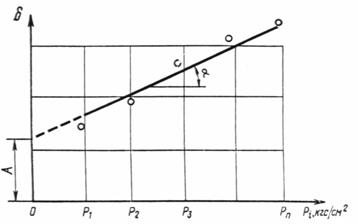 Совокупность величин di каждого слоя представляют в виде графика прямолинейной зависимости (см. чертеж). Построение графика di = f(Pi) выполняют в масштабе: для Р 1 кгс/см2 = 50 или 30 мм, для d 0,01 = 50 или 30 мм. За начальные значения Р1 и d1 (первая точка, включаемая в обработку) принимают такие значения, которые соответствуют природному давлению для исследуемого слоя грунта, за конечные значения Рп и dп (последняя точка, включаемая в обработку) такие, при которых нагрузка вызывает приращение осадки, превышающей ее значение на предыдущей ступени не более чем в два раза. Через нанесенные на график точки по методу наименьших квадратов проводят осредняющую прямую. Для построения осредняющей прямой допускается использование графических методов.
