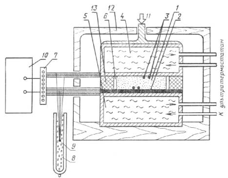 1 - образец грунта; 2 - тепломер; 3 - датчики температуры; 4 - верхняя термостатированная плита; 5 - нижняя термостатированная плита; 6 - обойма из органического стекла; 7 - переключатель; 8 - сосуд Дьюара; 9 - спай сравнения; 10 - потенциометр; 11 - прижимное устройство; 12 - теплоизоляционный кожух; 13 - поролон 4. ПОДГОТОВКА К ИСПЫТАНИЯМ4.1. Образец в обойме следует выдержать при отрицательной температуре, соответствующей температуре испытаний, не менее 6 ч для песчаных и гравийных и 12 ч для остальных грунтов. 4.2. Образец грунта с термопарами (не менее двух с каждой стороны) должен быть помещен на тепломер, уложенный на нижнюю термостатированную плиту. Термопары должны быть расположены на расстоянии 10 и 40 мм от центра образца. Сверху на образец следует установить верхнюю термостатированную плиту и прижать с помощью прижимного устройства под давлением 0,02 - 0,05 МПа (0,2 - 0,5 кгс/см2). Образец должен полностью перекрывать рабочую часть тепломера. Если размеры образца меньше размера термостатированных плит, оставшаяся часть пространства заполняется теплоизоляционным материалом (поролон). 4.3. С обеих сторон образца необходимо проложить резиновые прокладки или нанести консистентную смазку (например, солидол). 4.4. Собранную установку закрывают кожухом. 4.5. Термопары и тепломер подключают через переключатель к потенциометру. 4.6. Спай сравнения погружают в сосуд Дьюара с тающим льдом. 4.7. Термостатируемые плиты подключают к ультратермостатам (термоэлектрическим батареям). 5. ПРОВЕДЕНИЕ ИСПЫТАНИЙ5.2. Измерения показаний тепломера начинают не менее чем через 2 ч после включения ультратермостатов и выполняют на протяжении испытания через каждые 20 мин. 5.3. Окончание испытания определяется моментом, когда показание тепломера отличается от предыдущего показания не более чем на 5 %. При этом измеряют температуру верхней и нижней поверхностей образца. 6. ОБРАБОТКА РЕЗУЛЬТАТОВ ИСПЫТАНИЙ6.1. Теплопроводность грунта