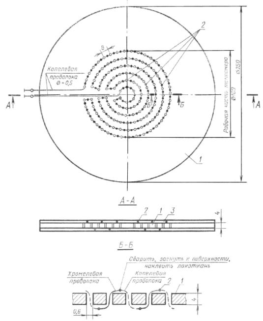 6.2. Теплопроводность определяют не менее чем для двух параллельных образцов исследуемого грунта. 6.3. Для теплотехнических расчетов значение теплопроводности принимают равным среднему арифметическому значению теплопроводностей, определенных для параллельных образцов грунта. ПРИЛОЖЕНИЕ 1Справочное ТЕРМИНЫ И ИХ ОПРЕДЕЛЕНИЯТеплопроводность грунта - теплофизическая характеристика грунта, определяющая его способность проводить тепло и численно равная плотности теплового потока в нем при градиенте температур равном единице. Единица измерения - Вт/(м·°С), [ккал/(м·ч·°С)]. Метод стационарного теплового режима - метод определения теплопроводности грунта по измеренному при испытании установившемуся (неизменному во времени) тепловому потоку через исследуемый образец при постоянных температурах и его противоположных поверхностях. ПРИЛОЖЕНИЕ 2Рекомендуемое РЕКОМЕНДАЦИИ ПО ИЗГОТОВЛЕНИЮ ТЕПЛОМЕРАТепломер представляет собой термобатарею, смонтированную на пластине из органического стекла диаметром 250 мм и толщиной 4 мм (см. чертеж). Термобатарея может быть изготовлена из отрезков хромелевых и копелевых проволок диаметром 0,2 мм, спаянных последовательно. Термобатарею размещают в средней части пластины диаметром 100 мм, имеющей 130 отверстий диаметром 0,6 мм на расстоянии 8 мм друг от друга. Спаи термобатареи располагают поочередно с одной и другой сторон пластины. К концам термобатареи приваривают (припаивают) две копелевые проволоки диаметром 0,5 мм. С обеих сторон тепломера клеем БФ-2 наклеивают слой лакоткани. Определяют градуировочный коэффициент изготовленного тепломера в соответствии с требованиями рекомендуемого приложения 3. Тепломер должен иметь чувствительность к тепловому потоку по э.д.с. не менее 0,12 мВ·Вт·м-2(0,10 мВ·ккал·м-2 × ч). Допускается измерять тепловой поток другими приборами, если их точность удовлетворяет предъявленным требованиям. Схема тепломера