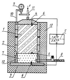 1 - образец грунта; 2 - обойма; 3 - нижняя термостатированная плита; 4 - верхняя термостатированная плита; 5 - блок автоматического терморегулирования; 6 - датчики температуры; 7 - капиллярно-пористый материал; 8 - устройство для подачи воды; 9 - индикатор перемещения; 10 - кронштейн; 11 - шток механизма для нагружения образца грунта; 12 - поддон обоймы; 13 - теплоизоляционный кожух