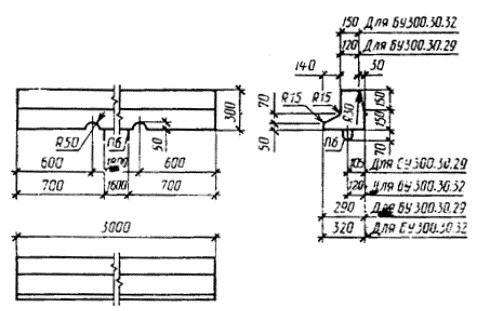 Примечание. Допускается замена в камнях марок БР300.30.15, БР300.30.18, БУ300.30.29, БУ300.30.32, БУП300.30.29, БУП300.30.32 стержневой горячекатаной арматуры периодического профиля класса А-III диаметром 6 мм на арматурную проволоку периодического профиля Вр-I площадью рабочего сечения, эквивалентной по прочности классу А-III. ПРИЛОЖЕНИЕ 3Рекомендуемое ВАРИАНТ АРМИРОВАНИЯ КАМНЕЙ1. Установка монтажных петель камней типов БР100 и БВ100 приведена на черт. 25. 2. Армирование камней длиной 3,0 м приведено на черт. 26 и 27; детали армирования приведены на черт. 28 - 32 и в табл. 13. 3. Спецификация арматурных изделий на один камень приведена в табл. 14. Расход стали на одно арматурное изделие и на один камень приведен в табл. 15 и 16. Установка монтажных петель камней типов БР100 и БВ100 Черт. 25 Армирование камней марок БР300.30.15, БР300.30.18, БР300.45.18 и БР300.60.20 БР300.30.15 и БР300.30.18 Черт. 26 Армирование камней марок ВУ300.30.29 и БУ300.30.32 Черт. 27 Деталь армирования камней Нижние стержни сеток и поз. 16 - 18 условно не показаны. Черт. 28 Арматурные сетки С1 и С2