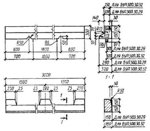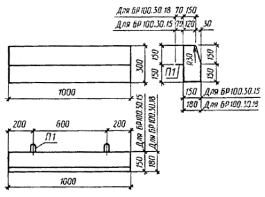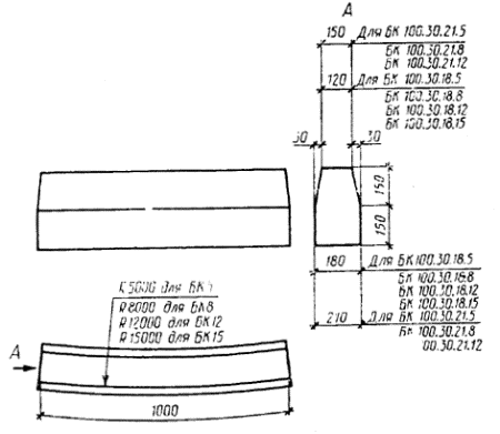 Максимальная ширина раскрытия трещин при испытании на прочность и трещиностойкость не должна превышать 0,2 мм. Испытание камней нагружением проводят после достижения камнями прочности на сжатие в 28-дневном возрасте. 3.2. Прочность бетона на сжатие и растяжение при изгибе следует определять по ГОСТ 10180 или ГОСТ 17624, или ГОСТ 22690. При изготовлении камней по способу - вибропрессования, приводящему к изменению состава бетона, принимают поправочный коэффициент к прочности бетона контрольных образцов, устанавливаемый экспериментально в соответствии с требованиями ГОСТ 10180. При этом поправочный коэффициент следует принимать не менее 1. 3.3. Морозостойкость бетона определяют по ГОСТ 10060 или ГОСТ 26134 при насыщении образцов бетона камней перед испытанием 5 %-ным водным раствором хлорида натрия. При этом допускается снижение прочности на сжатие бетона образцов не более чем на 5 % и потеря их массы не более чем на 3 %. 3.4. Водопоглощение бетона камней определяют по ГОСТ 12730.3. 3.5. Удобоукладываемость бетонной смеси определяют по ГОСТ 10181.0 и ГОСТ 10181.1. 3.6. Объем вовлеченного воздуха в бетонной смеси с воздухововлекающими добавками контролируют по ГОСТ 10181.0 и ГОСТ 10181.3. 3.7. Контроль сварных арматурных изделий следует проводить по ГОСТ 10922 и ГОСТ 23858. 3.8. Силу натяжения арматуры, контролируемую по окончании натяжения, измеряют по ГОСТ 22362. 3.9. Размеры и положение арматурных изделий в камне, толщину защитного слоя бетона до арматуры следует определять по ГОСТ 17625 или ГОСТ 22904. При отсутствии необходимых приборов допускается определение указанных параметров вырубкой борозд и обнажением арматуры камня с последующей заделкой борозд и мест обнажений арматуры мелкозернистым бетоном или бетоном, из которого изготовлен камень. 3.10. Размеры, отклонения от прямолинейности и перпендикулярности камней, ширину раскрытия технологических трещин, размеры раковин, наплывов и околов бетона следует проверять методами, установленными ГОСТ 26433.0 и ГОСТ 26433.1. Длину криволинейных камней измеряют по верхнему краю выпуклой стороны, а отклонение профиля лицевой поверхности от номинальной кривизны проверяют шаблоном. 4. ТРАНСПОРТИРОВАНИЕ И ХРАНЕНИЕКамни в открытых вагонах и на грузовых автомобилях следует перевозить в пакетах контейнерах по ГОСТ 20259 или на поддонах по ГОСТ 18343 с перевязкой их стальной лентой по ГОСТ 3560 или проволокой по ГОСТ 3282, обеспечивающих жесткую фиксацию и сохранность камней. 4.2. Запрещается погрузка камней навалом и разгрузка их сбрасыванием. 4.3. Камни следует хранить на складе готовой продукции рассортированными по маркам в штабелях или пакетах высотой до 2 м. ПРИЛОЖЕНИЕ 1Обязательное РАЗМЕРЫ И ПОКАЗАТЕЛИ МАТЕРИАЛОЕМКОСТИ КАМНЕЙ1. Размеры камней приведены: типа БР100 на черт. 2 » БР300 » » 3 » БР600 » » 4 марки БР100.20.8 » » 5 типа БУ380 » » 6 » БУП300 » » 7 марки БУП600.30.32-АIV » » 8 типа БЛ300 » » 9 » БВ100 » » 10 » БК100 » » 11 Примечания: 1. На нелицевой вертикальной поверхности камней допускается делать выемку кессонного типа глубиной не более 50 мм, при этом толщина камня должна быть не менее 80 мм. 2. Допускается по заказу потребителя камни марки БР100.20.8 изготовлять длиной 0,6 и 0,8 м. 3. При технико-экономическом обосновании допускается изготовление камней типов БР100 и БВ100 лицевой поверхностью вниз с установкой монтажных петель в соответствии с приложением 3. 4. Допускается изготовлен