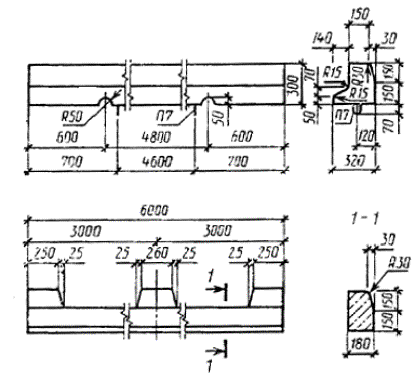 Примечание. Длину аппарели (lа) при тротуарных покрытиях из сборных плит принимают кратной размеру плит, а другие размеры - в зависимости от марки камня. Допускается изготовление камней с технологическим уклоном нелицевых вертикальных граней до 5 %, закруглением лицевых граней радиусом до 5 мм и нелицевых - до 15 мм или фасками шириной до 10 мм. 1.2.4. Армирование камней приведено в приложении 2, при технико-экономическом обосновании допускается вариант армирования, приведенный в приложении 3. 1.2.5. Камни длиной 1,0 м из мелкозернистого бетона следует изготовлять по технологии вибропрессования или другой технологии, обеспечивающей физико-механические характеристики по настоящему стандарту. Камни длиной 3,0 и 6,0 м следует изготовлять из тяжелого бетона, армированными. Примечание. Камни длиной 1,0 м из тяжелого бетона допускается изготавливать до 01.01.96. 1.2.6. Камни обозначают марками в соответствии с ГОСТ 23009. Марка камня состоит из буквенно-цифровых групп, разделенных тире. Первая группа содержит обозначение типа камня, длину, высоту и ширину камня в сантиметрах, радиус кривизны в метрах для криволинейных камней; вторая - класс напрягаемой арматуры. Пример условного обозначения камня типа БР длиной 1000 мм, высотой 300 мм и шириной 180 мм: БР 100.30.18 То же, типа БК длиной 1000 мм, высотой 300 мм и шириной 180 мм с радиусом кривизны 8 м: БК 100.30.18.8 То же, типа БР длиной 6000 мм, высотой 300 мм и шириной 180 мм с напрягаемой арматурой класса А-IV: БР600.30.18-АIV 1.3. Характеристики 1.3.1. Камни должны быть прочными и трещиностойкими. Армированные камни при испытании на прочность и трещиностойкость нагружением должны выдерживать контрольные нагрузки, приведенные в табл. 2. 1.3.2. Бетон камней марки БР 100.20.8 должен соответствовать классу бетона по прочности на сжатие не менее чем В22,5, а бетон остальных марок камней - не менее чем В30. Класс бетона по прочности на растяжение при изгибе принимают не менее чем Вtb 3,2 для камней марки БР 100.20.8 и не менее чем Вtb 4,0 - для остальных марок. Таблица 2
