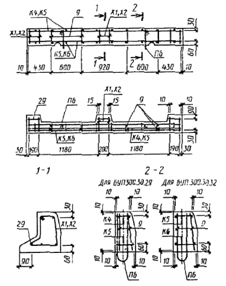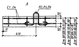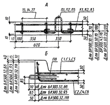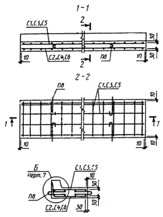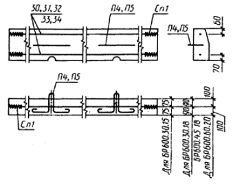 Черт. 12 Армирование камней марок БР600.30.15-АIV, БР600.30.18-АIV, БP600.45.18-AIV, БР600.60.20-AIV, БP600.45.18-AV и БP600.60.20-AV Черт. 13 Примечание. Допускается не устанавливать спирали Сп1 при гарантированном отсутствии трещин в бетоне на торцах плит. Армирование камней марок БУ300.30.29 и БУЗ300.30.32 Черт. 14 Армирование камней марок БУП300.30.29 и БУП300.30.32 Черт. 15 Армирование камней марки БУП600.30.32-АIV Черт. 16 Примечание. Допускается не устанавливать спирали Сп1 при гарантированном отсутствии трещин в бетоне на торцах камней. Армирование камней марок БЛ300.32.68, БЛ300.32.93 и БЛ300.32.118 Черт. 17 Детали армирования камней Черт. 18 Арматурные сетки С1 и С2 Черт. 19 Примечание к черт. 19 - 21. Допускается изменение шага поперечных стержней при условии обеспечения эквивалента прочности сечения. Арматурные сетки С3 и С4