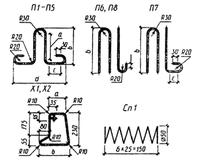 Черт. 23 Монтажные петли П1 - П8, хомуты X1, Х2 и спираль Сп1 Черт. 24 Таблица 9 мм