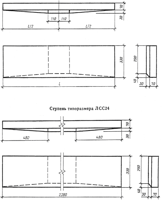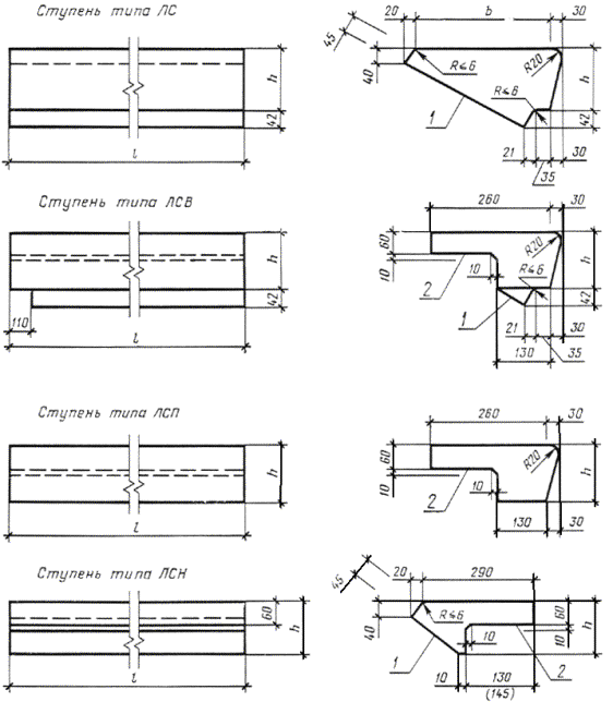 Постановлением Государственного комитета СССР по делам строительства от 23 апреля 1984 г. № 58 срок введения установлен с 01.01.86 Несоблюдение стандарта преследуется по закону Настоящий стандарт распространяется на железобетонные и бетонные ступени, изготовляемые из тяжелого бетона, легкого бетона и плотного силикатного бетона и предназначенные для устройства внутренних и наружных лестниц зданий и сооружений. Бетонные ступени предназначены для устройства лестниц по сплошному основанию. Ступени применяют: для отапливаемых зданий и сооружений; для неотапливаемых зданий и сооружений и на открытом воздухе при расчетной температуре наружного воздуха (средней температуре воздуха наиболее холодной пятидневки района строительства согласно СНиП 2.01.01-82) до минус 40 °С включительно; при неагрессивной степени воздействия среды на железобетонные конструкции. Допускается применять ступени в зданиях и сооружениях с расчетной сейсмичностью до 9 баллов включительно, в неотапливаемых зданиях и сооружениях и на открытом воздухе при расчетной температуре наружного воздуха ниже минус 40 °С, а также в условиях воздействия агрессивной среды при соблюдении дополнительных требований, установленных проектной документацией в соответствии с требованиями СНиП II-7-81, СНиП 2.03.01-84, СНиП 2.03.11-85 и СН 165-76 и указанных в заказе на изготовление ступеней. Показатели технического уровня, установленные настоящим стандартом, предусмотрены для ступеней высшей и первой категорий качества. (Измененная редакция, Изм. № 1). 1. ТИПЫ, ОСНОВНЫЕ ПАРАМЕТРЫ И РАЗМЕРЫ1.1. Ступени в зависимости от их формы и расположения в лестничном марше подразделяют на следующие типы: ЛС - основная; ЛСВ - верхняя фризовая; ЛСП - площадочный вкладыш; ЛСН - нижняя фризовая; ЛСС - плоская для сквозных маршей. Схемы расположения ступеней в лестничном марше приведены в справочном приложении. 1.2. Форма и размеры ступеней, а также их показатели материалоемкости должны соответствовать указанным на черт. 1, 2 и в табл. 1. 1.3. Ступени изготовляют железобетонными. Основные ступени (типа ЛС) длиной до 1500 мм включительно для лестниц, устраиваемых по сплошному основанию, изготовляют бетонными.