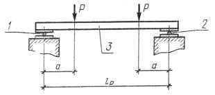 2.13. Категории бетонных поверхностей ступени: лицевой шлифованной мозаичной - А0 или А1; лицевой гладкой - А1 или А2; лицевой, предназначенной под окраску, - А3; нелицевой, не видимой в условиях эксплуатации, - А7. Требования к качеству поверхностей и внешнему виду ступеней - по ГОСТ 13015.0-83 и настоящему стандарту. 2.13.1. Верхняя лицевая поверхность ступеней партии должна иметь одинаковый цвет и тон окраски. Поверхность мозаичного декоративного конструкционного слоя должна иметь равномерное (или предусмотренное проектной документацией и заказом) распределение мраморного щебня. В первом случае участки без мраморного щебня площадью более 3 см2 не допускаются. 2.13.2. На поверхностях ступеней не допускаются трещины в бетоне, за исключением усадочных и других местных поверхностных технологических шириной не более 0,1 мм на нижней и торцевых поверхностях ступеней. 2.13.3. Ступени высшей категории качества должны иметь верхнюю лицевую поверхность шлифованную мозаичную или гладкую категории А1. 3. ПРАВИЛА ПРИЕМКИ3.1. Приемку ступеней следует производить партиями в соответствии с требованиями ГОСТ 13015.1-81 и настоящего стандарта. 3.2. Приемку ступеней по показателям их прочности и трещиностойкости, по морозостойкости, водонепроницаемости и истираемости бетона следует производить по результатам периодических испытаний. 3.3. Приемку ступеней по показателям прочности (классу по прочности на сжатие, отпускной прочности) и средней плотности бетона, соответствия арматурных и закладных изделий требованиям ГОСТ 8717.1-84, прочности сварных соединений, точности геометрических параметров, толщины защитного слоя бетона до арматуры, ширины раскрытия усадочных трещин, категории бетонной поверхности следует производить по результатам приемо-сдаточных испытаний и контроля. 3.3.1. В случаях, если при проверке будет установлено, что фактическая отпускная прочность бетона ниже требуемой отпускной прочности, то поставку ступеней потребителю следует производить после достижения бетоном прочности, соответствующей классу бетона по прочности на сжатие. 3.3.2. При приемке ступеней по показателям точности геометрических параметров, ширины раскрытия усадочных трещин, категории бетонной поверхности следует применять выборочный одноступенчатый контроль. 4. МЕТОДЫ КОНТРОЛЯ И ИСПЫТАНИЙ4.1. Испытание ступеней нагружением для определения их прочности и трещиностойкости следует производить по достижении бетоном прочности, соответствующей классу бетона по прочности на сжатие. Прочность и трещиностойкость ступеней следует контролировать по ГОСТ 8829-85. 4.1.1. Схемы опирания и загружения ступеней при испытании их нагружением приведены: типов ЛС, ЛСВ, ЛСП и ЛСН - на черт. 3; типоразмеров ЛСС12 и ЛСС15 - на черт. 4; типоразмера ЛСС24 - на черт. 5. Основные параметры опирания и загружения ступеней и значения контрольных нагрузок при проверке прочности и трещиностойкости приведены в табл. 3 и 4. 4.2. Прочность бетона на сжатие следует определять по ГОСТ 10180-78 на серии образцов, изготовленных из бетонной смеси рабочего состава. Допускается фактическую отпускную прочность бетона определять ультразвуковым методом по ГОСТ 17624-78 или другими методами, предусмотренными стандартами на методы испытаний бетона. 4.3. Морозостойкость бетона следует определять по ГОСТ 10060-87. 4.4. Водонепроницаемость бетона 