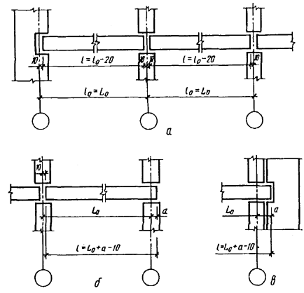 3.3. Форма и размеры плит должны соответствовать установленным рабочими чертежами на эти плиты. 3.4. Конструктивную длину и ширину плиты принимают согласно ГОСТ 28984 равными соответствующему координационному размеру плиты, уменьшенному на зазор между смежными плитами. При разработке рабочих чертежей плит массового применения зазор между смежными плитами следует принимать равным 20 мм (рисунок 1а). В случае необходимости перекрытия плитой пространства, превышающего расстояние между соседними координационными осями здания, конструктивную длину плит (например, плит, опираемых на стены лестничной клетки крупнопанельных зданий с поперечными несущими стенами) принимают равной расстоянию между осями, увеличенному на необходимую величину а, определяемую в соответствии с принятым конструктивным решением (рисунок 1б, 1в). 3.5. Координационную длину и ширину плит при разработке новых проектов жилых крупнопанельных зданий рекомендуется принимать в соответствии с таблицей 2 с учетом максимальной грузоподъемности монтажных кранов. lо - координационная длина плиты; l - конструктивная длина плиты; Lо - расстояние между поперечными координационными осями здания; а - привязка боковой грани плиты к координационной оси 3.6. Рабочие чертежи плит массового применения рекомендуется разрабатывать на следующие расчетные нагрузки (без учета собственного веса плиты): 2,0; 3,0; 4,5; 6,0 кПа. 3.7. Плиты длиной более 4789 мм, предназначенные для опирания по двум сторонам и изготовляемые в горизонтальном положении, рекомендуется предусматривать предварительно напряженными. 3.8. Выбор типов плит производят в соответствии с приведенной в приложении А областью их применения в зависимости от требуемых значений индекса изоляции воздушного шума и приведенного уровня ударного шума под плитой и с учетом максимального шага поперечных несущих стен и применяемой конструкции пола. 3.9. Боковые грани плит всех типов могут иметь технологические скосы. Таблица 2